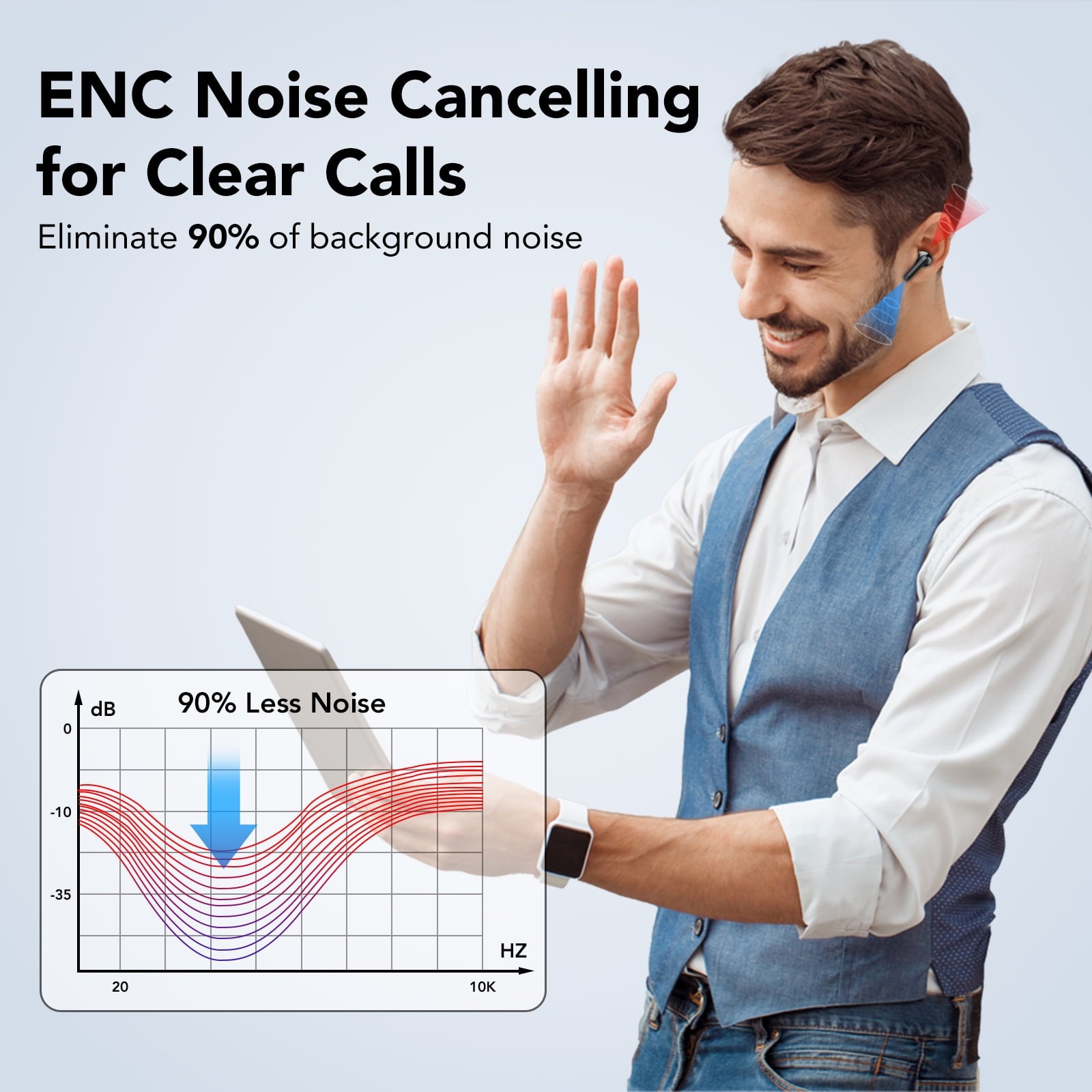 - Los auriculares inalámbricos bluetooth están equipados con micrófonos duales ENC, manteniendo un contacto de señal ininterrumpido con la persona que llama. Disfrute de conversaciones claras durante las llamadas, despídase del ruido de fondo y concéntrese en las conversaciones que tenga a mano.
