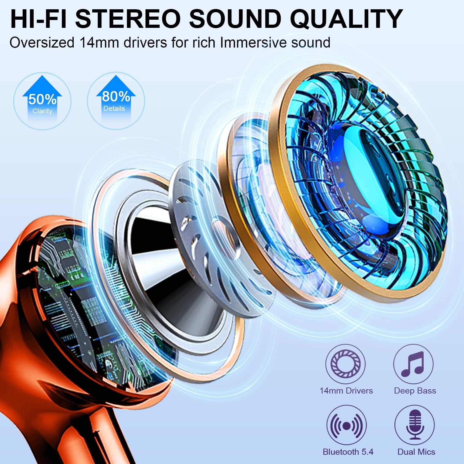 - 2025 Bluetooth 5.4 Tecnología: Los auriculares inalámbricos utilizan el chipset bluetooth 5.4. Hay una transmisión de señal más rápida y estable y ha logrado con éxito una baja latencia sin interrupción. Con un alcance de hasta 15 m, ya sea que esté en casa, en la oficina o en la carretera, no tiene que preocuparse por la desconexión de los auriculares bluetooth. Emparejamiento automático y compatible con múltiples dispositivos.