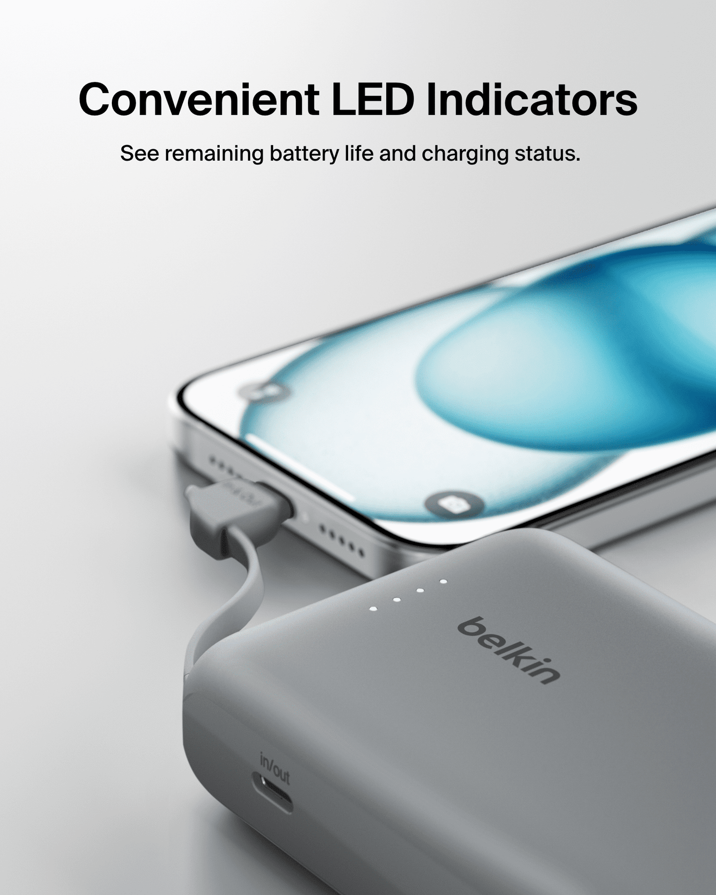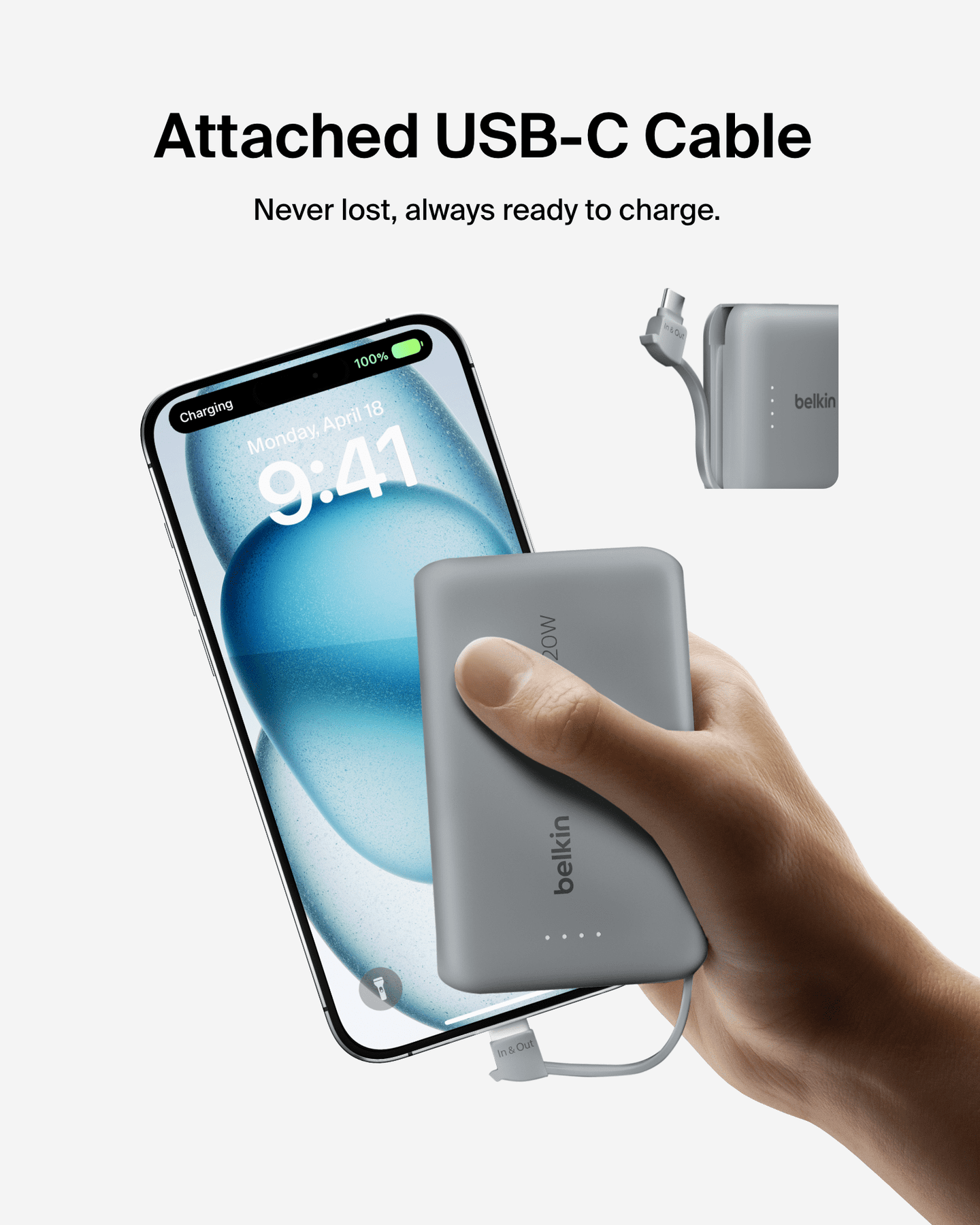 Belkin Cargador Portátil, Banco de Energía de 10,000 Mah con Cable Integrado - Suministro de Energía USB-C de Carga Rápida de 20 Vatios, Cargador de iPhone Portátil para la Serie iPhone 16, iPad Pro, Galaxy S25 y Más - Gris
