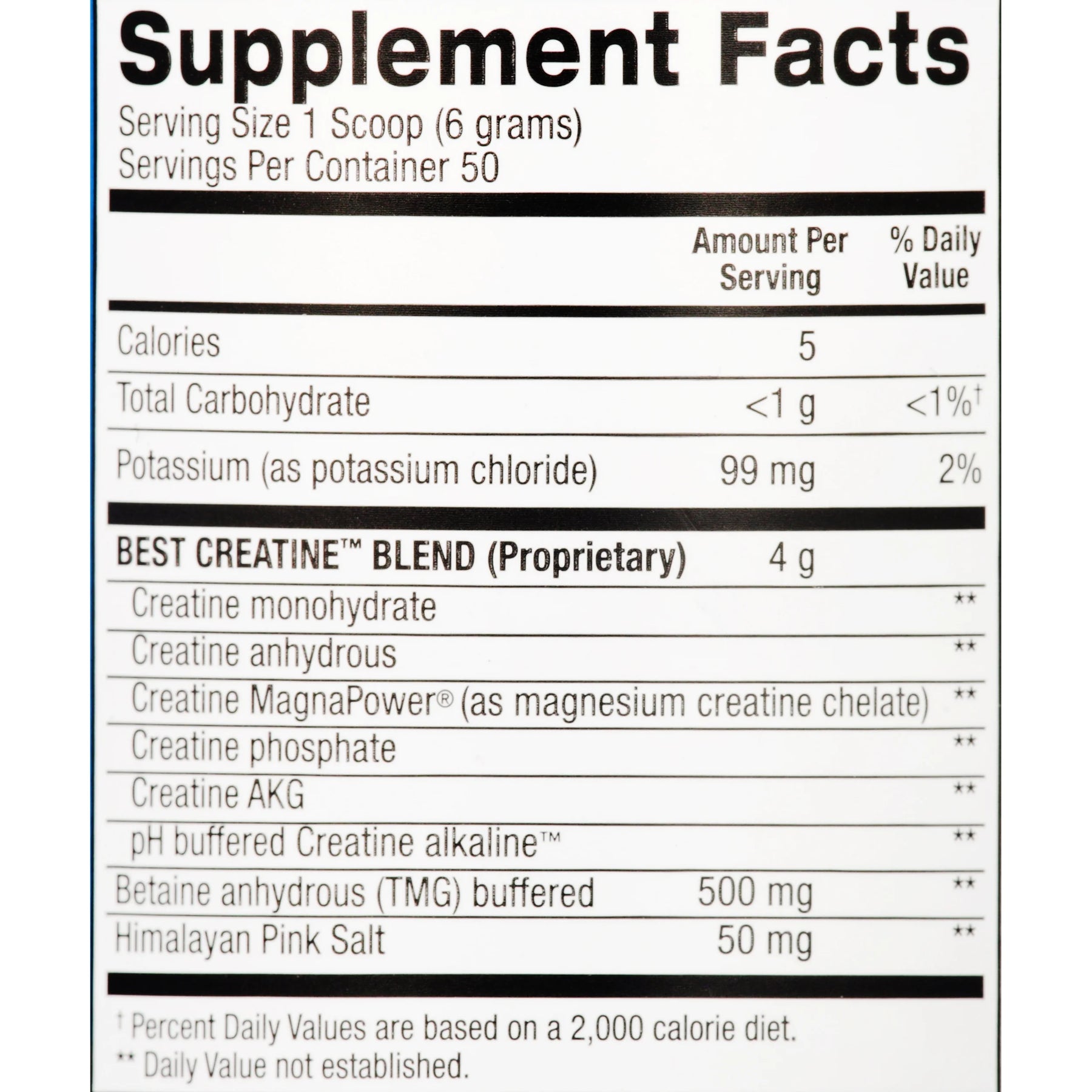Tamaño de la porción 1 Cucharada (6 gramos) Porciones por envase 50 Potasio (como cloruro de potasio) MEJOR CREATINA? MEZCLA (Propietaria) Creatina monohidratada Creatina anhidra Creatina MagnaPower® (como quelato de creatina de magnesio) Creatina fosfato Creatina AKG creatina tamponada creatina alcalina? Betaína anhidra (TMG) tamponada Sal Rosa del Himalaya Otros ingredientes: sabores naturales y artificiales, ácido cítrico, ácido málico, maltodextrina, sílice, sucralosa, acesulfame k, y FD&C Rojo No. 40.