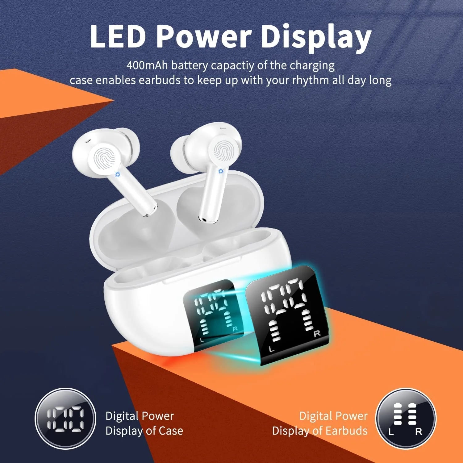 Auriculares Inalámbricos Bluetooth con 60H de Tiempo de Reproducción, Estuche de Carga con Pantalla LED, Auriculares In-Ear con Micrófono para Teléfonos Android, Juegos, Computadoras, Laptops, Deportes, Color Blanco