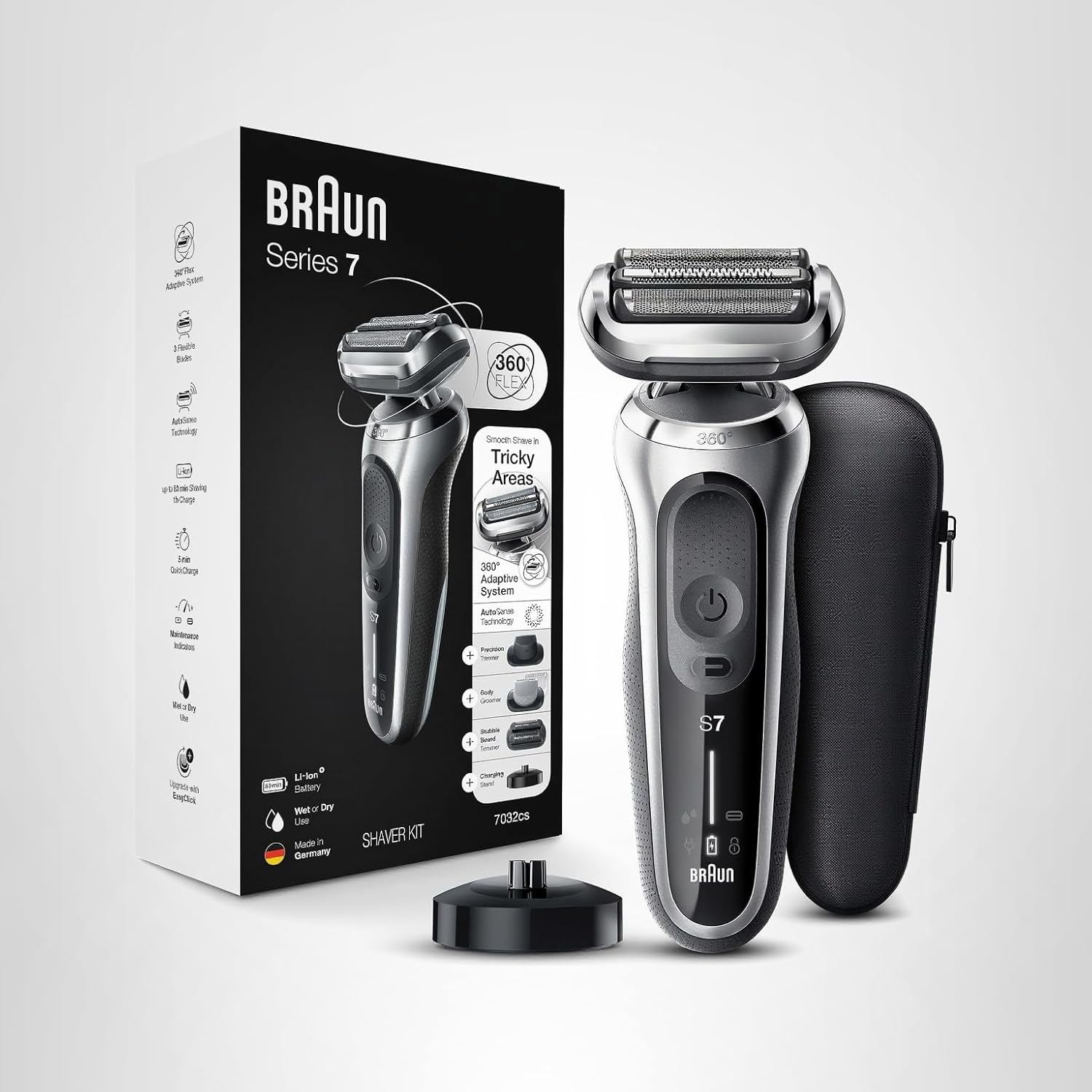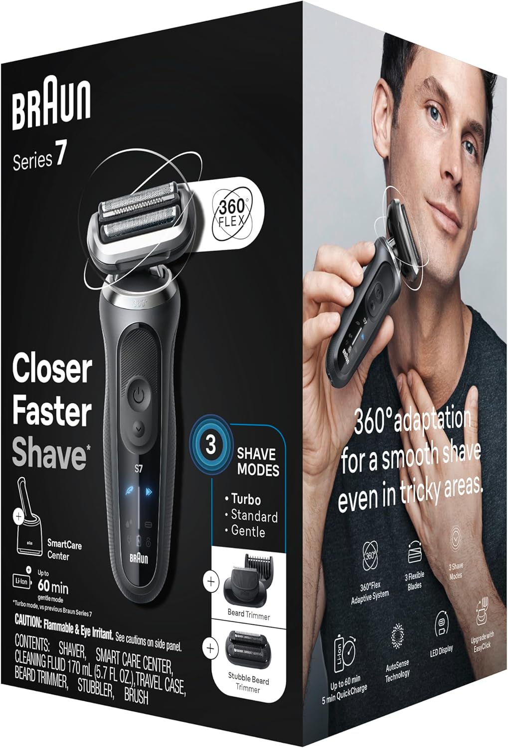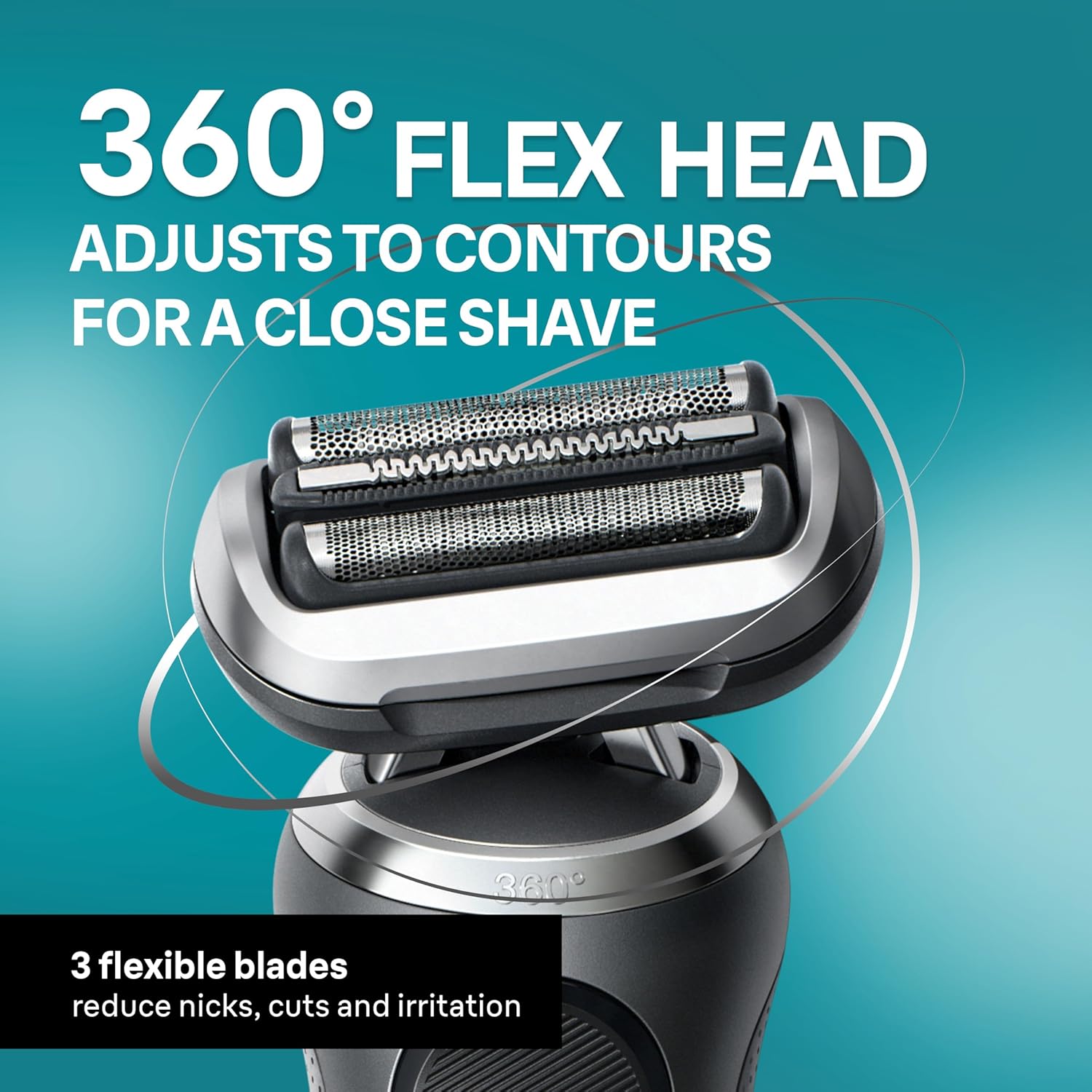 Para un afeitado cercano, más rápido*: el cabezal flexible de 360° se adapta a tus contornos para un afeitado extremadamente cercano, incluso en zonas difíciles (*frente a la Braun Series 7 anterior)