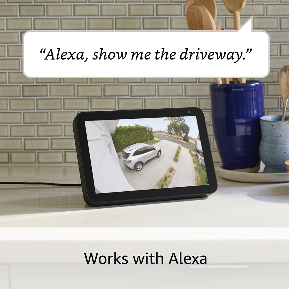 - Para mayor paz mental, vincula el dispositivo con Alexa para ayudarte a echarle un ojo a tu casa. Conéctalo a Alexa para escuchar las alertas de movimiento en tu dispositivo Echo compatible y ver el video en vivo con un Echo Show, Fire TV o tablet Fire. Habla con los visitantes con solo decir: “Alexa, conecta con la puerta principal”.