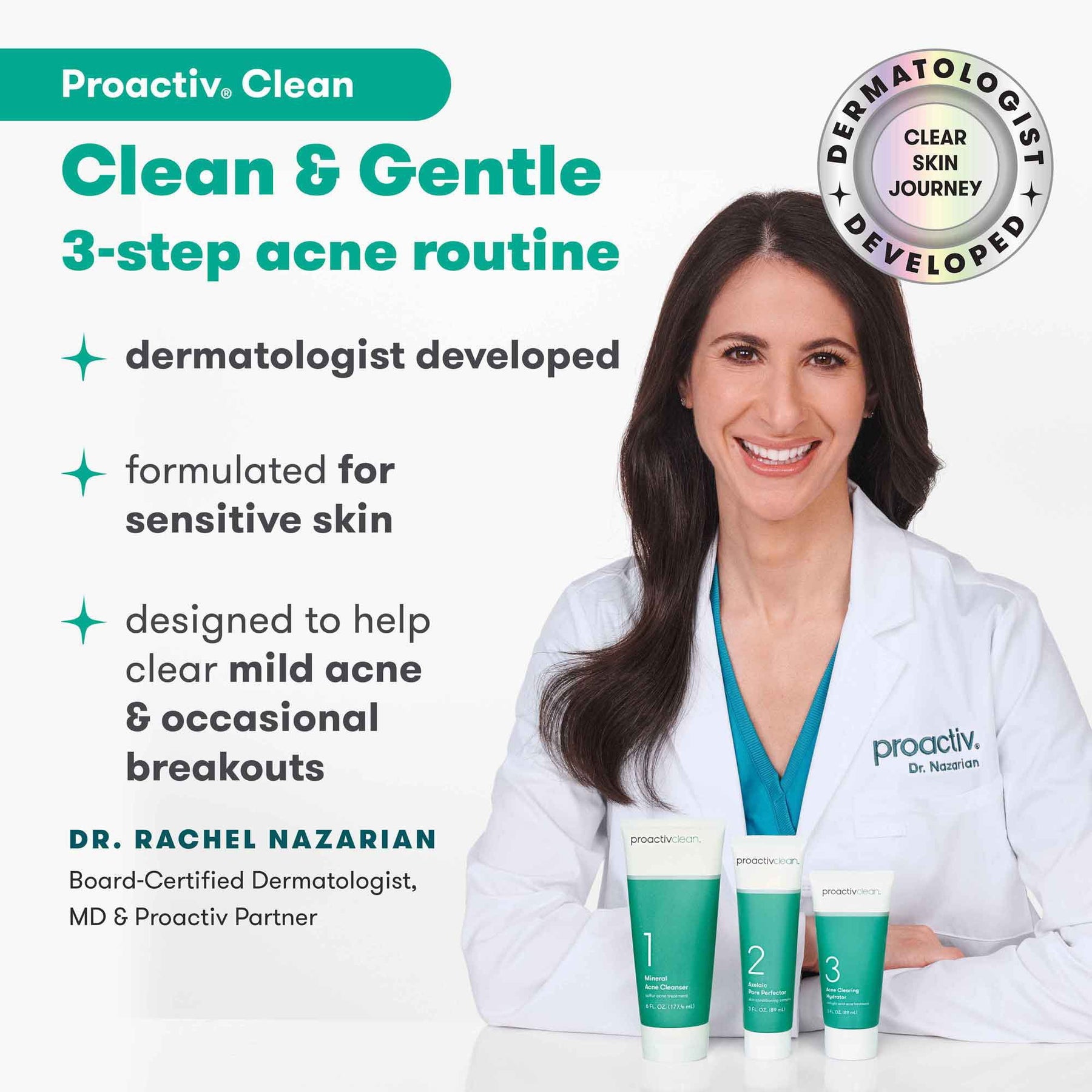 • Proactiv Clean Rutina de tratamiento del acné de 3 pasos Introduciendo Proactiv Clean Un enfoque más limpio y suave para el acné leve y los brotes ocasionales Desarrollado con un dermatólogo para aquellos que experimentan acné leve o brotes ocasionales,