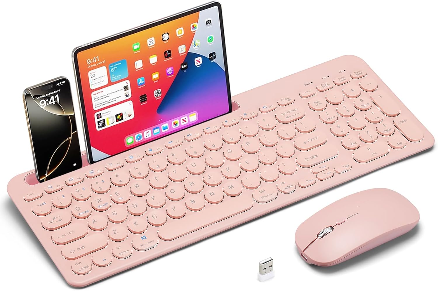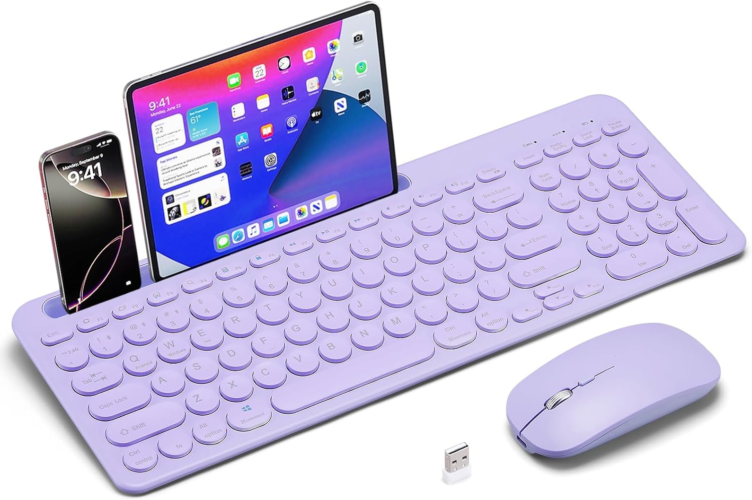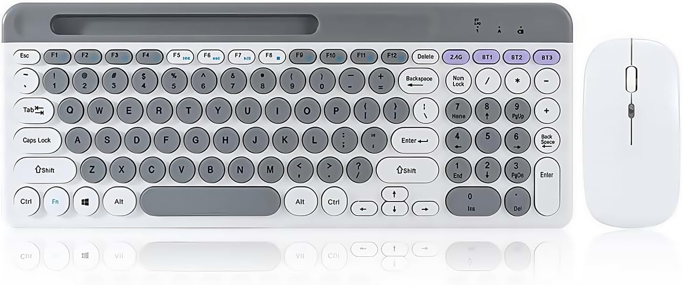 Combo de teclado y mouse inalámbricos con soporte para tableta de teléfono, modo dual recargable (Bluetooth 5.0 y 3.0 + 2.4G) mouse silencioso multidispositivo para Windows, iPad, tableta, MacOS, iOS