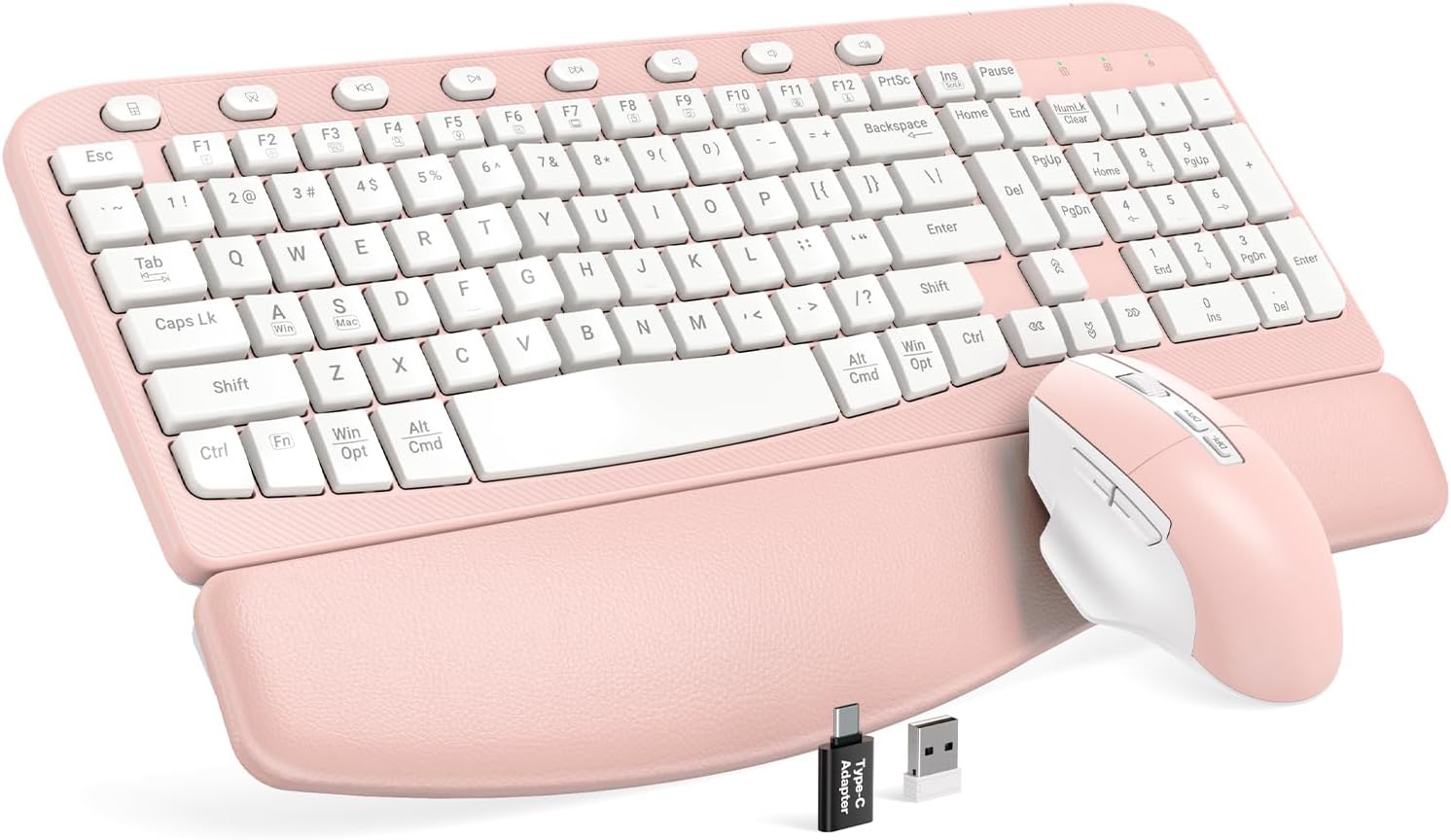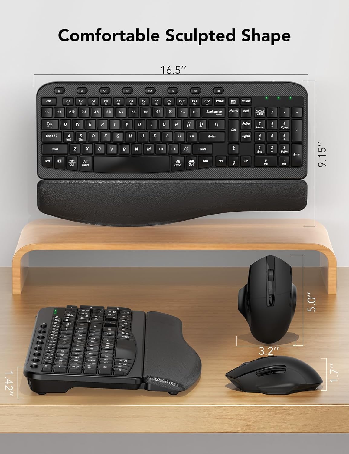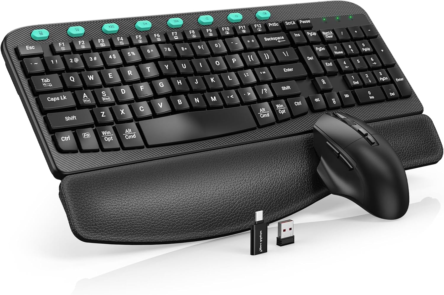 Combo de teclado y mouse inalámbricos: llave ergonómica de onda, reposamanos suave de cuero integrado, tamaño completo 2.4G, 8 teclas de acceso rápido, mouse de 6 botones con DPI de 4 niveles, doble