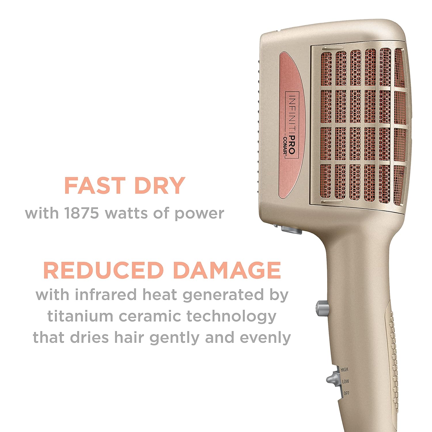 Muéstrale al encrespamiento quién manda: La secadora INFINITIPRO de CONAIR sin encrespamiento tiene 1875 vatios para una tecnología potente, de secado rápido y cerámica de titanio que crea calor uniforme para proteger el cabello de daños.