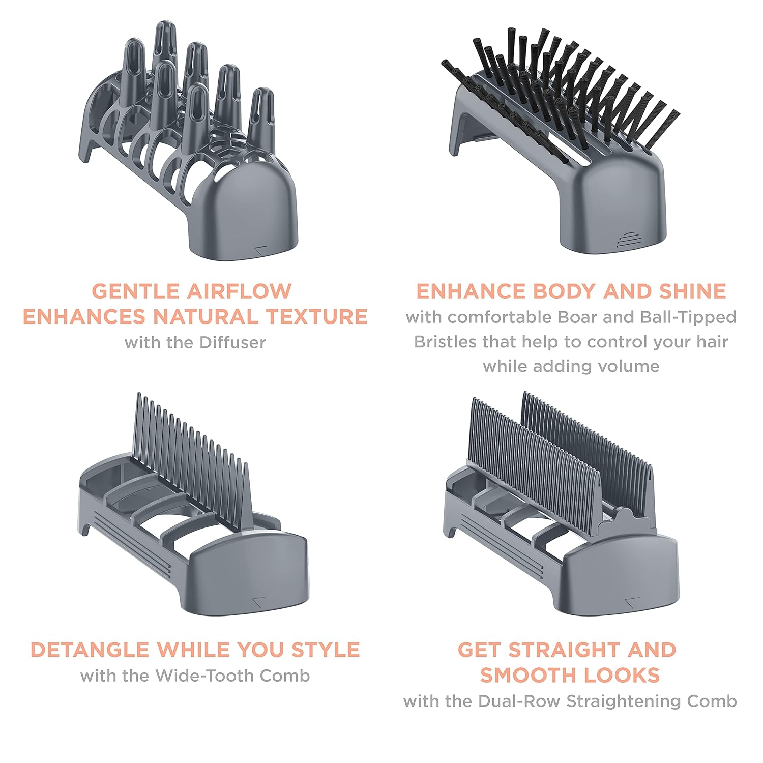 Control de peinado: 3 ajustes de calor y 2 velocidades para personalizar tu propio peinado único + botón de aire frío para bloquear el peinado en su lugar. Incluye 4 accesorios para una textura natural, cuerpo y brillo mejorados, dispositivo para desenredar y peine alisador de doble fila para estilos elegantes y suaves.