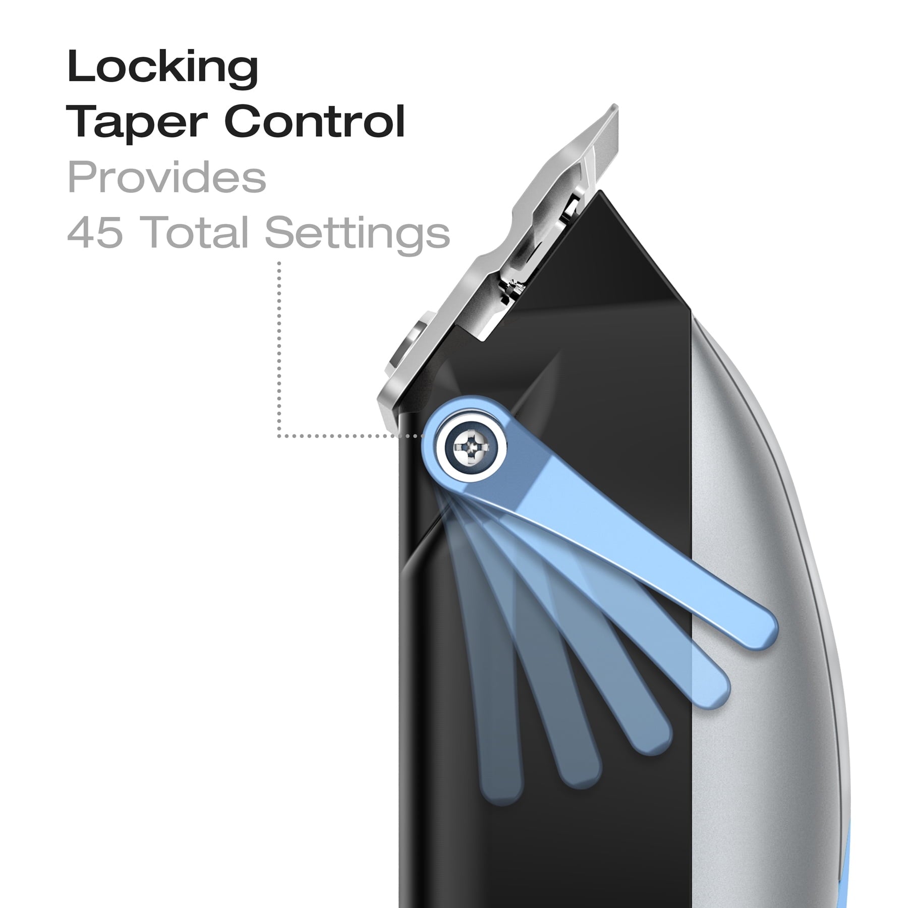 - Hoja de acero inoxidable: la hoja de acero inoxidable autoafilable ofrece un afilado sin preocupaciones, mientras que el control de conicidad de bloqueo proporciona 45 ajustes totales