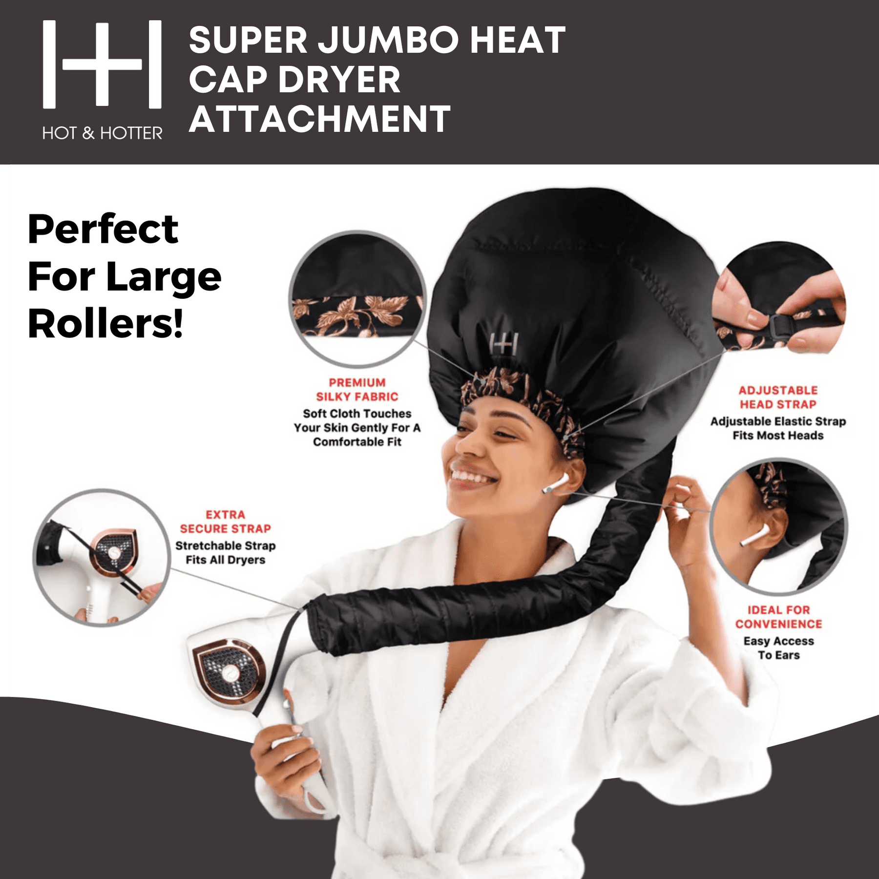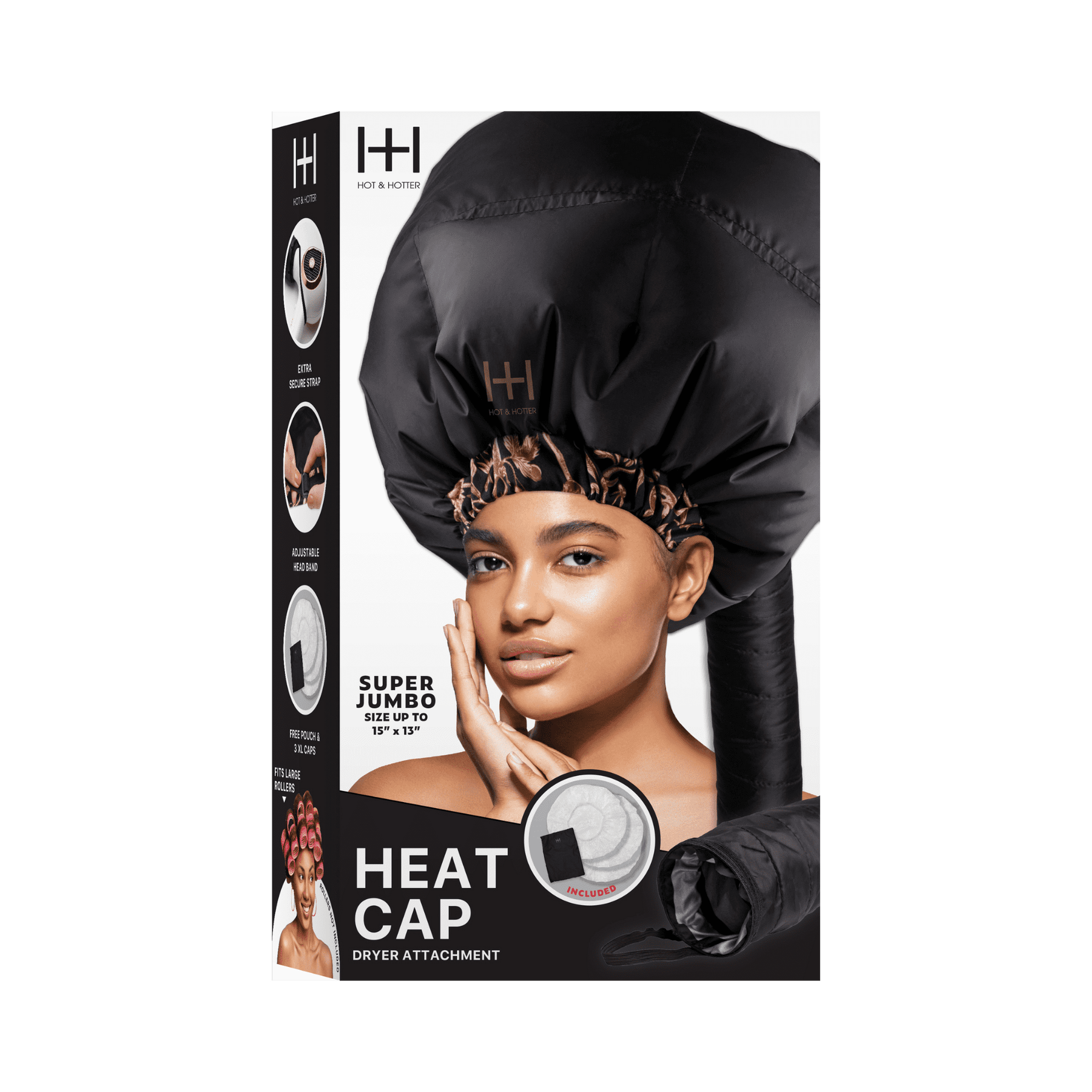 ¡Prepárate para elevar tu rutina de cuidado del cabello con el accesorio para secador Super Jumbo Hot & Hotter Heat Cap en elegante negro! Este elegante must-have es su compañero perfecto para el secado, el tratamiento y el ajuste del rodillo. Sumérgete en la máxima comodidad con su tejido sedoso y correa elástica ajustable, lo que garantiza un ajuste perfecto para la mayoría de los tamaños de cabeza. Además, viene con una bolsa gratuita y tres tapas de procesamiento XL. Diseñado exclusivamente para mujer, este es su nuevo cuidado del cabello esencial!
