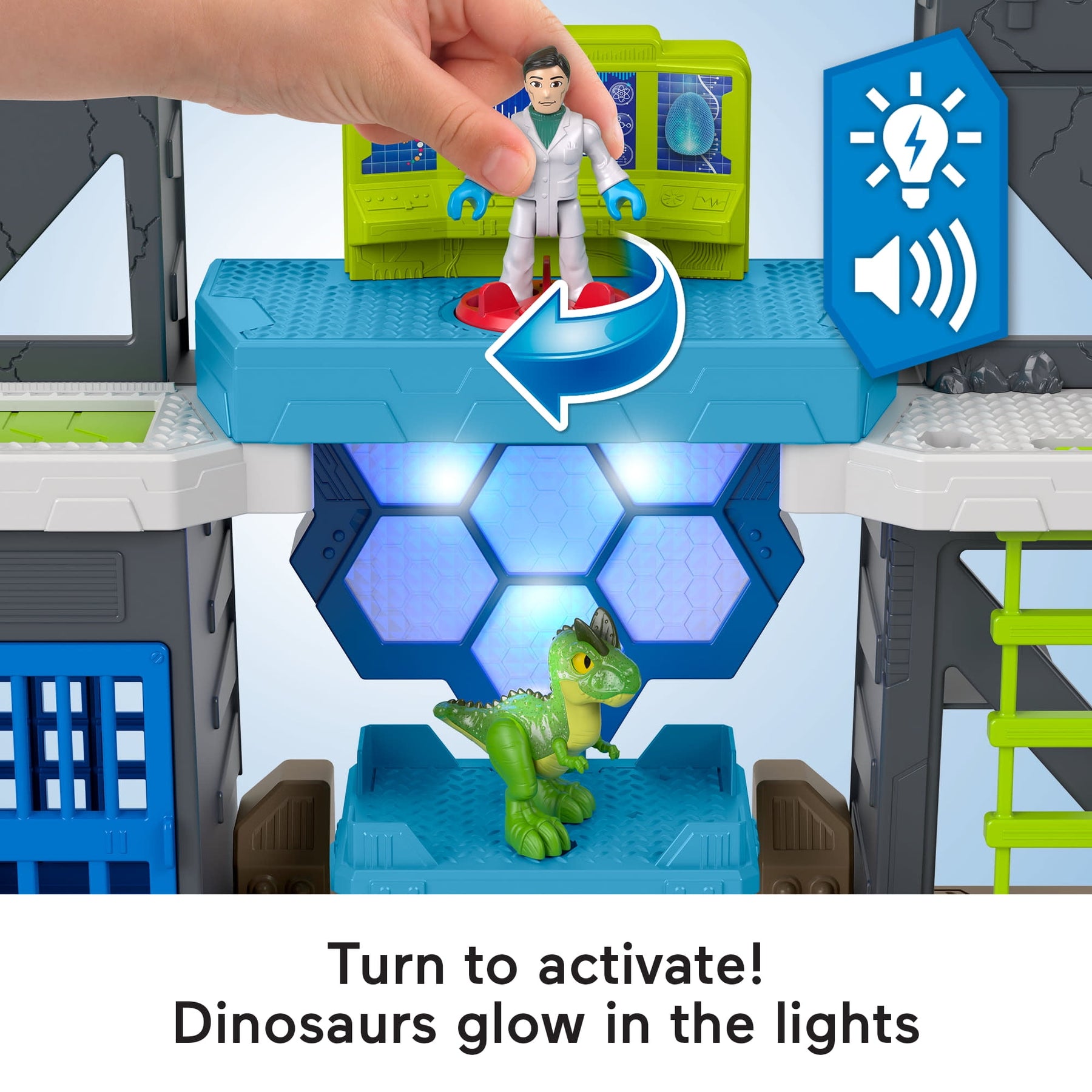 - Inspirado en las películas de Jurassic World, este juego de laboratorio tiene luces frescas, sonidos y juguetes de dinosaurios que brillan mientras los niños los "escanear"!