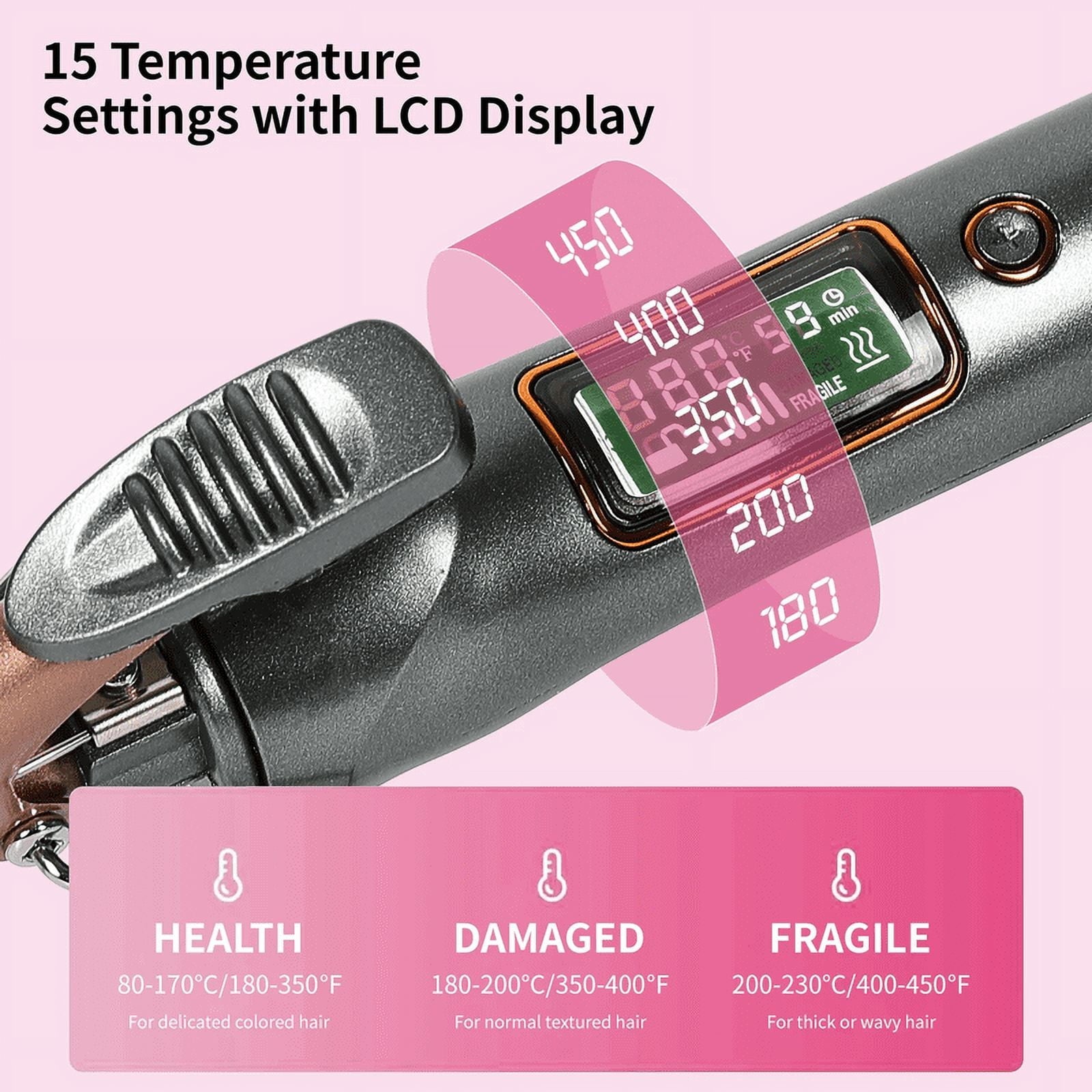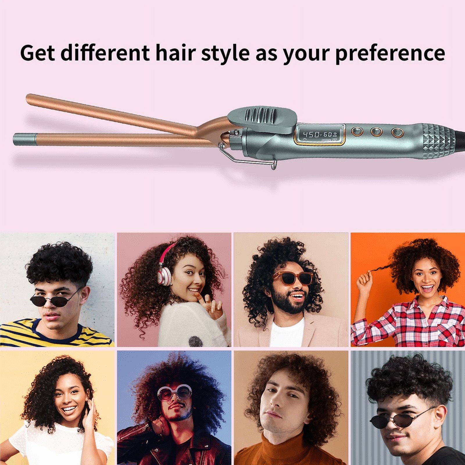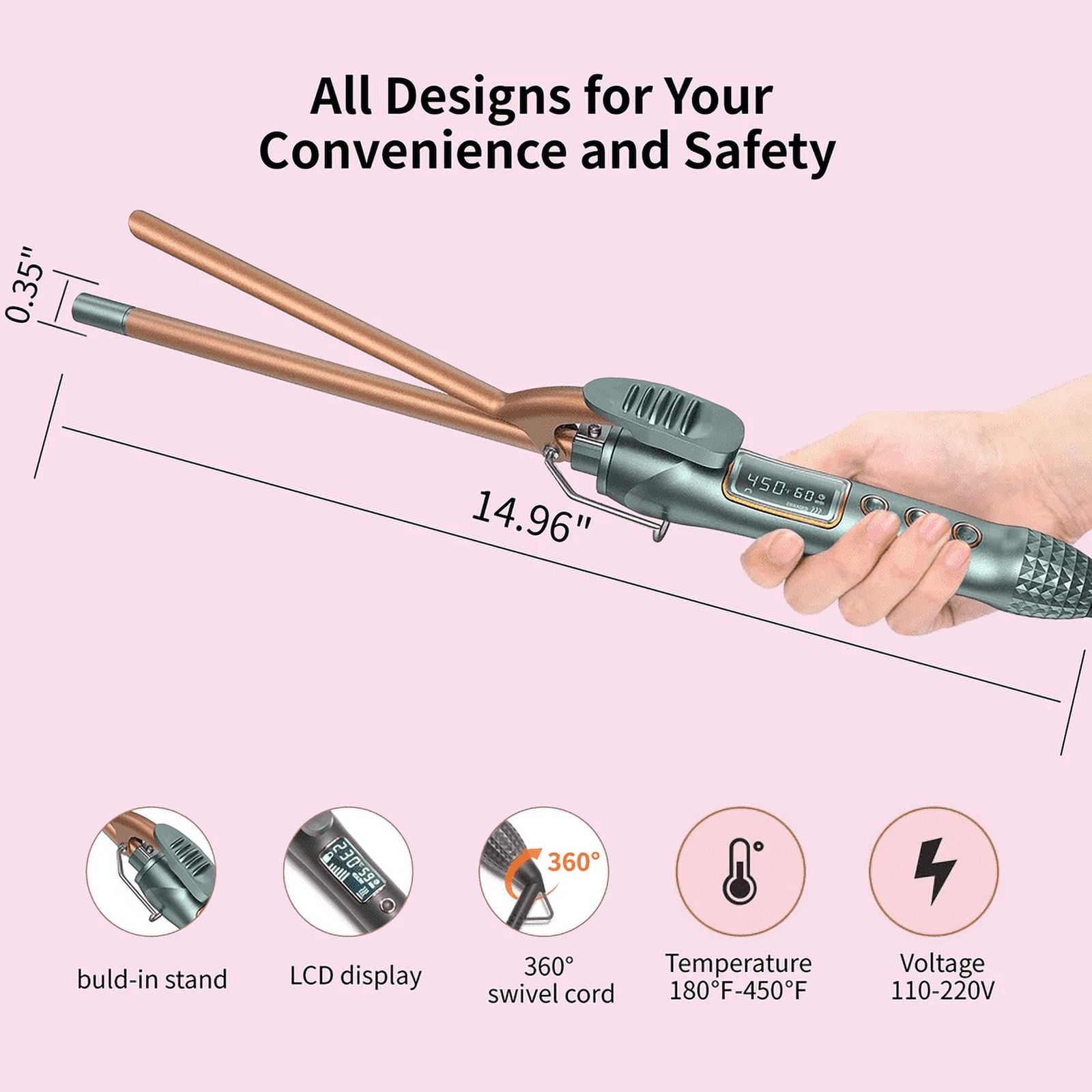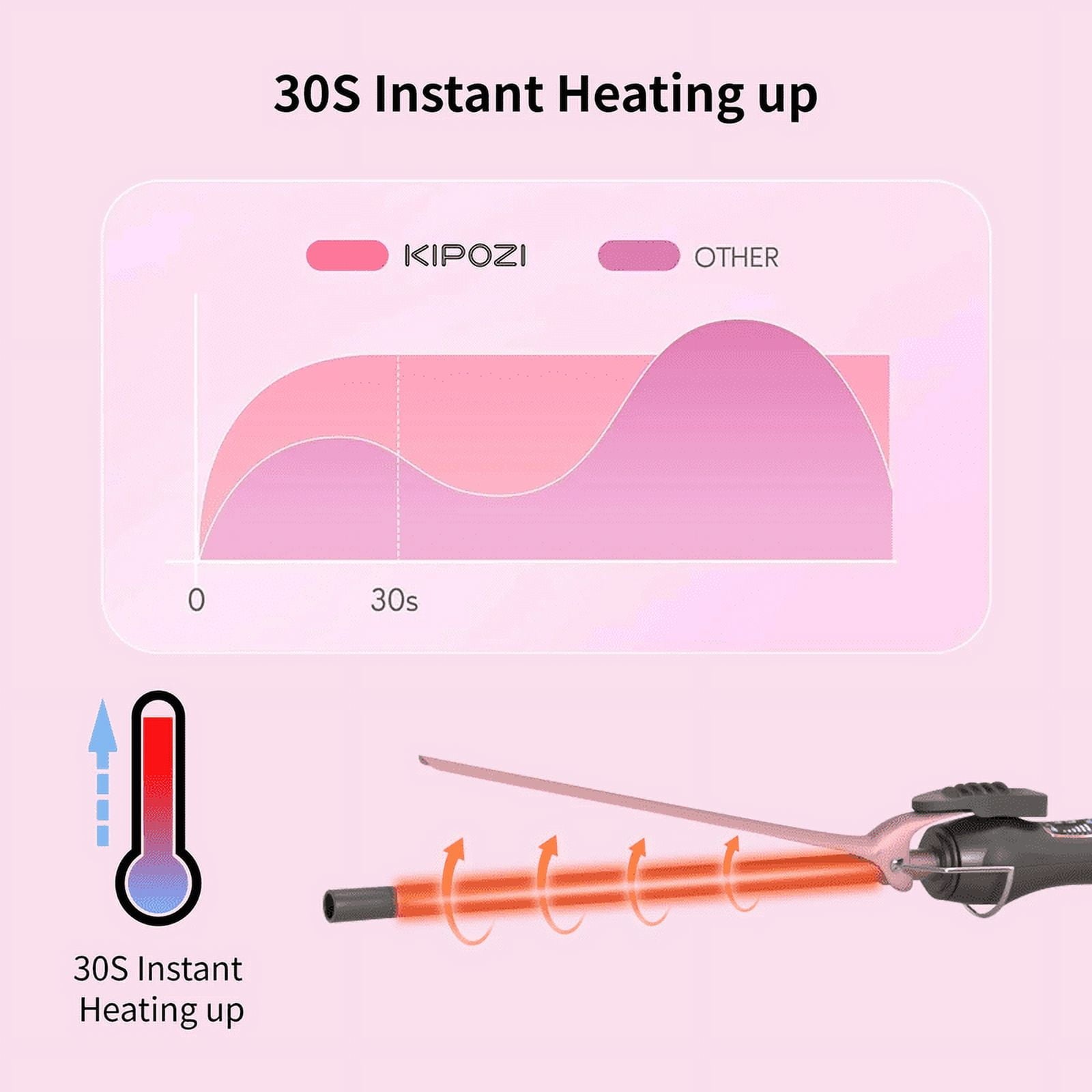 Nuestro pequeño rizador Kipozi cuenta con un barril de 3/8 pulgadas con un revestimiento de cerámica que elimina la estática y mantiene la humedad bloqueada sin engancharse o tirar del cabello. Este rizador es adecuado para el cabello medio y largo. Nuestro rizador de varitas está equipado con calentadores PTC duales que calientan hasta 180 ° F en solo 30 segundos, lo que permite un estilo instantáneo, que es muy fácil de crear pequeños rizos retro. Puedes crear rizos bonitos y duraderos en minutos, un buen compañero, especialmente en las mañanas apresuradas. Este rizador de barril largo de 3/8 pulgadas ofrece temperaturas ajustables con 15 opciones de control precisas, que van desde 180 ° F a 450 ° F. Esta amplia gama de ajustes de temperatura lo hace adecuado para varios tipos de cabello, incluidos cabello delgado, normal y grueso. La función de cierre automático de 60 minutos y el cable giratorio de 360 ° de 6,5 ° F de largo para un estilo sin enredos garantizan una experiencia segura y cómoda al usar este rizador. Con el "soporte de acero inoxidable", puede evitar que el tubo de calefacción toque directamente la superficie del escritorio. La pequeña varita rizada viene con doble voltaje mundial 100-240V perfecto para viajar.