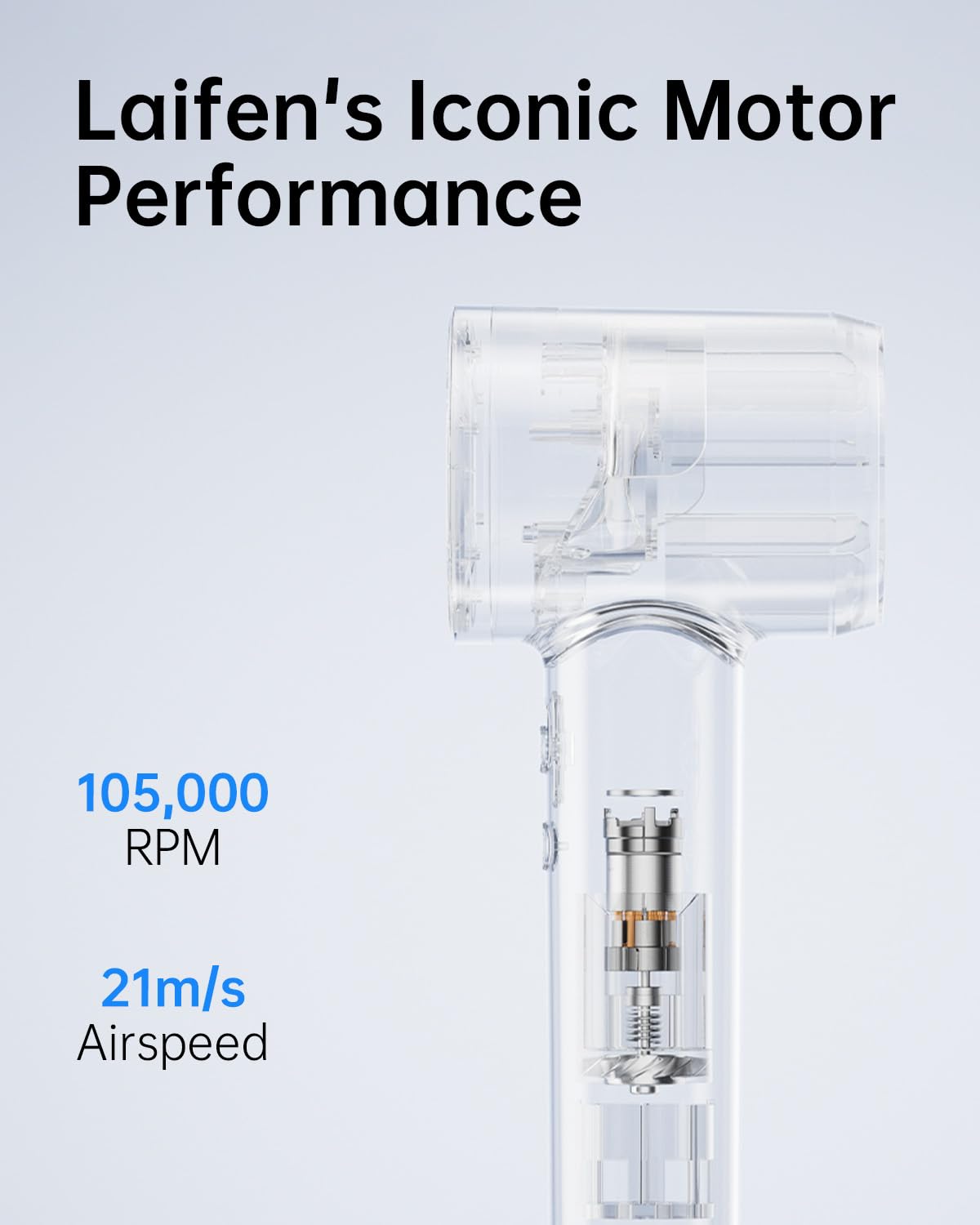 Secado rápido: el secador de pelo Laifen está equipado con un motor sin escobillas de alta velocidad de 105.000 rpm con velocidad de viento de 68.9 ft/s. El fuerte flujo de aire puede secar el cabello en poco tiempo, acelerar tu rutina