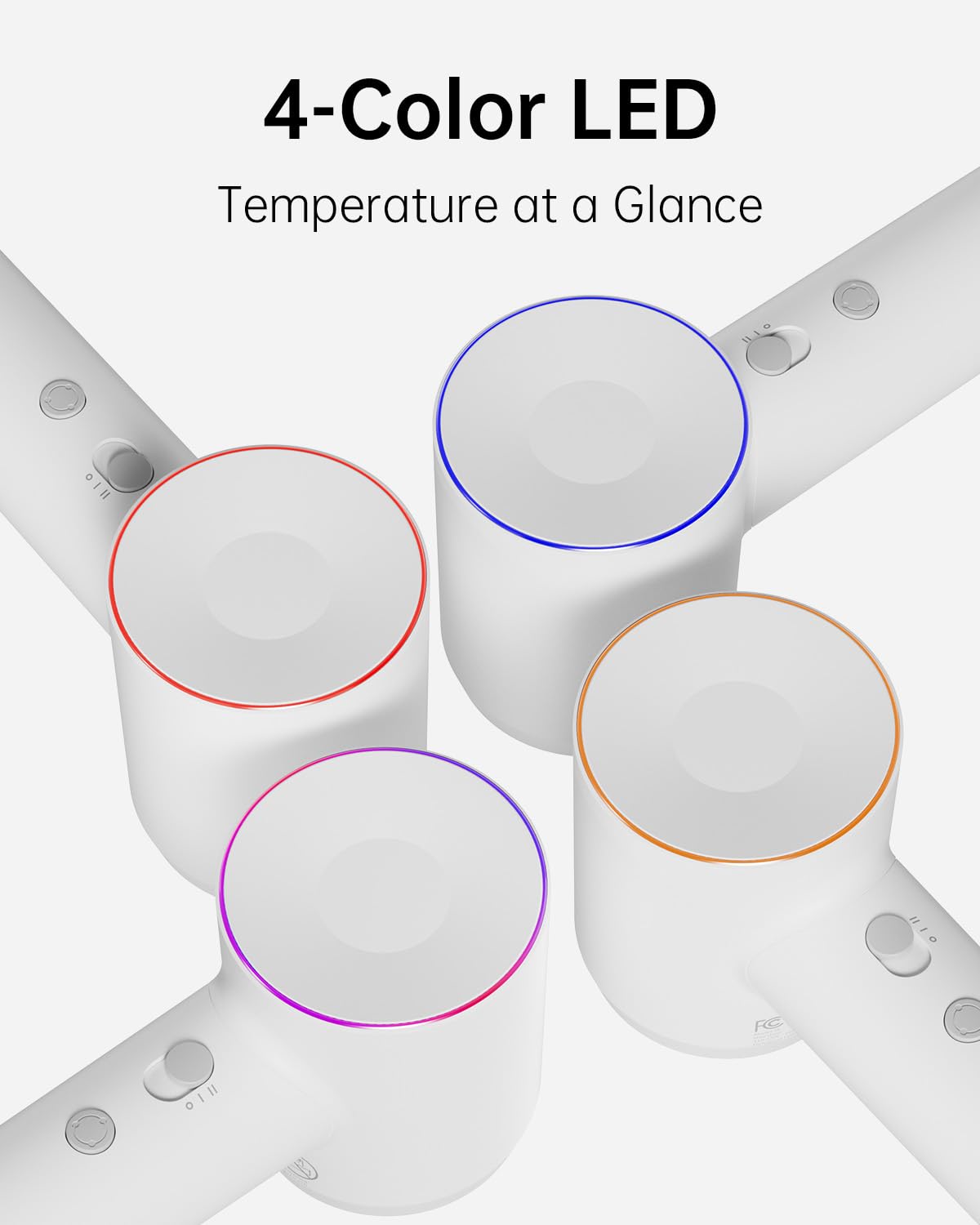 Anillo de luz LED de 4 colores y bajo nivel de ruido: los tres colores que se muestran en el anillo LED circular corresponden a los ajustes de temperatura del secador de pelo. El rojo indica 80 grados (aire caliente), el amarillo es de 50 grados (aire caliente), el azul es aire frío. Mantenga presionado durante dos segundos para activar el modo de circulación cambiando el aire caliente y frío cada pocos segundos. A pesar del potente motor y la velocidad del viento, el secador de pelo Laifen funciona a 59 dB mientras está en uso y no es molesto.