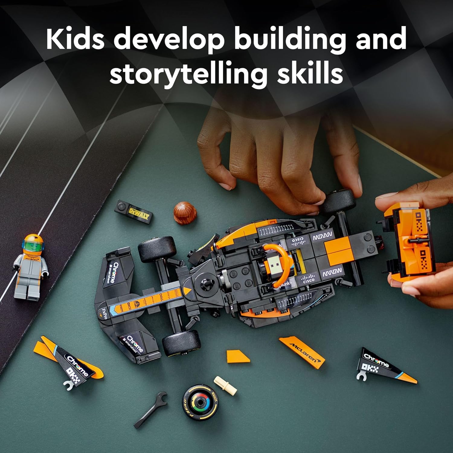Los niños y niñas de 9 años en adelante pueden coleccionar, construir y exhibir este Automóvil de Carreras de Fórmula 1 McLaren 2023 LEGO Speed Champions (76919).
