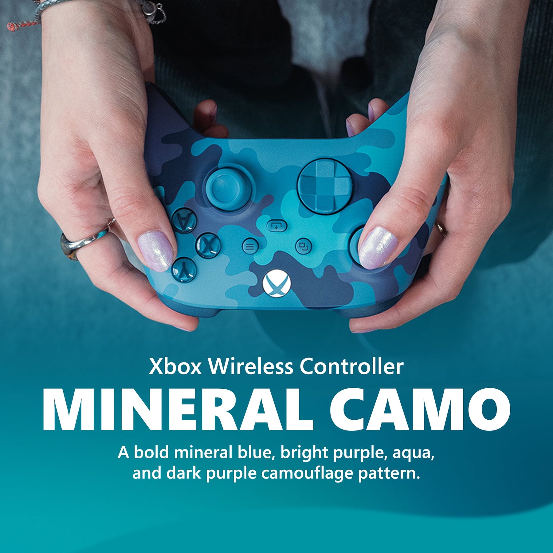 - Experimente el control inalámbrico Xbox – Mineral Camo Special Edition, con un llamativo patrón de camuflaje azul mineral, púrpura brillante, aqua y púrpura oscuro.