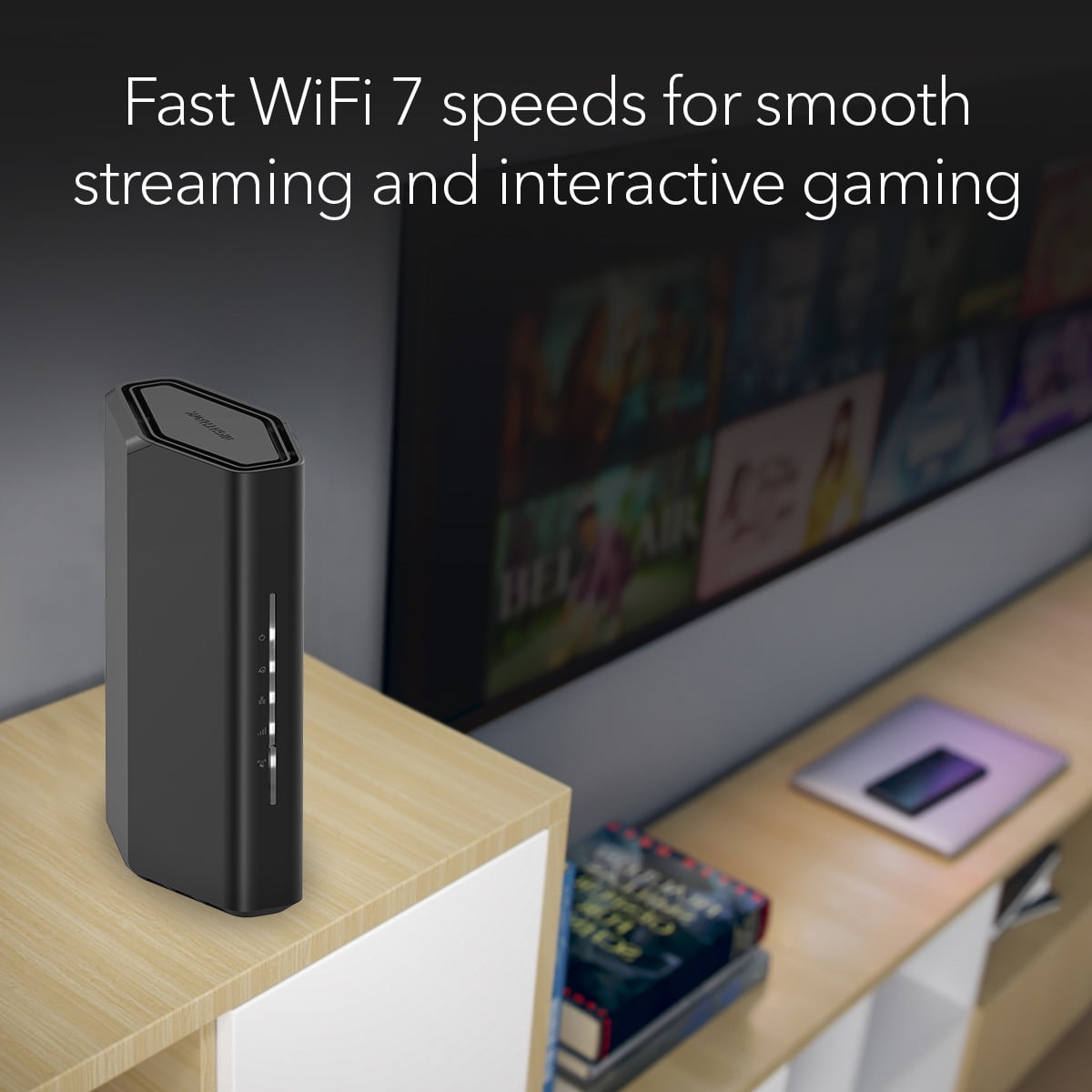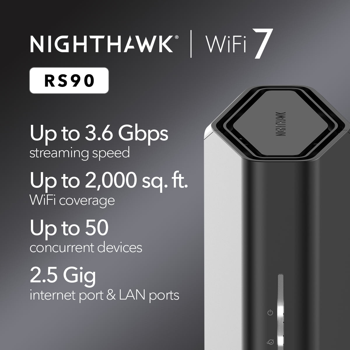 Aproveche la potencia de WiFi 7 para velocidades de hasta 3.6 Gbps a 1.2 veces más rápido que WiFi 6. El router de banda dual Nighthawk RS90 WiFi 7 ofrece hasta 2.000 metros cuadrados. ft. Cobertura WiFi y capacidad para hasta 50 dispositivos. Experimenta una transmisión impresionante, videoconferencias y conecta de manera confiable dispositivos domésticos inteligentes. NETGEAR Armor protege el WiFi de tu familia creando un escudo automático para todos los dispositivos conectados.