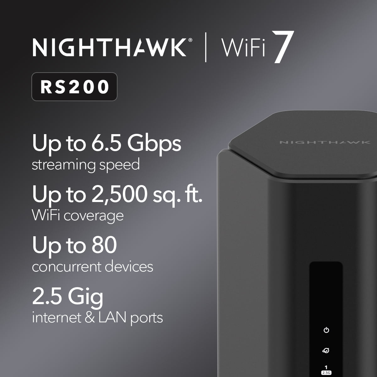 Aproveche la potencia de WiFi 7 para velocidades de hasta 6.5 Gbps a un 20% más rápido que WiFi 6. El router de banda dual Nighthawk RS200 WiFi 7 ofrece hasta 2.500 metros cuadrados. ft. Cobertura WiFi y capacidad para hasta 80 dispositivos. Disfruta de una impresionante transmisión 4K, videoconferencia y conecta de forma fiable dispositivos domésticos inteligentes. Dimensiones del producto: 9.8 x 5.9 x 4 pulg.