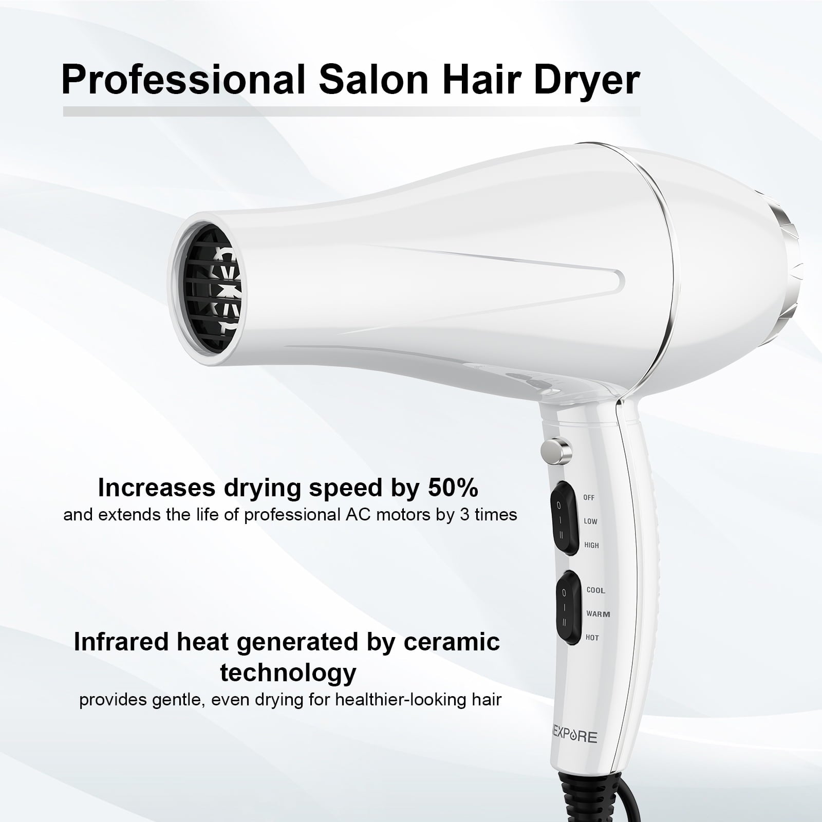 - Secador de pelo profesional con iones negativos: el secador de soplado profesional NEXPURE 1875W cuenta con un potente motor de CA para un secado rápido y resultados de calidad en el salón. La tecnología iónica reduce el encrespamiento y mejora el brillo, dejando el cabello suave y saludable. Diseñado con un cuerpo ligero y un cable de 1,8 M, ofrece un estilo sin esfuerzo en casa o en cualquier lugar.