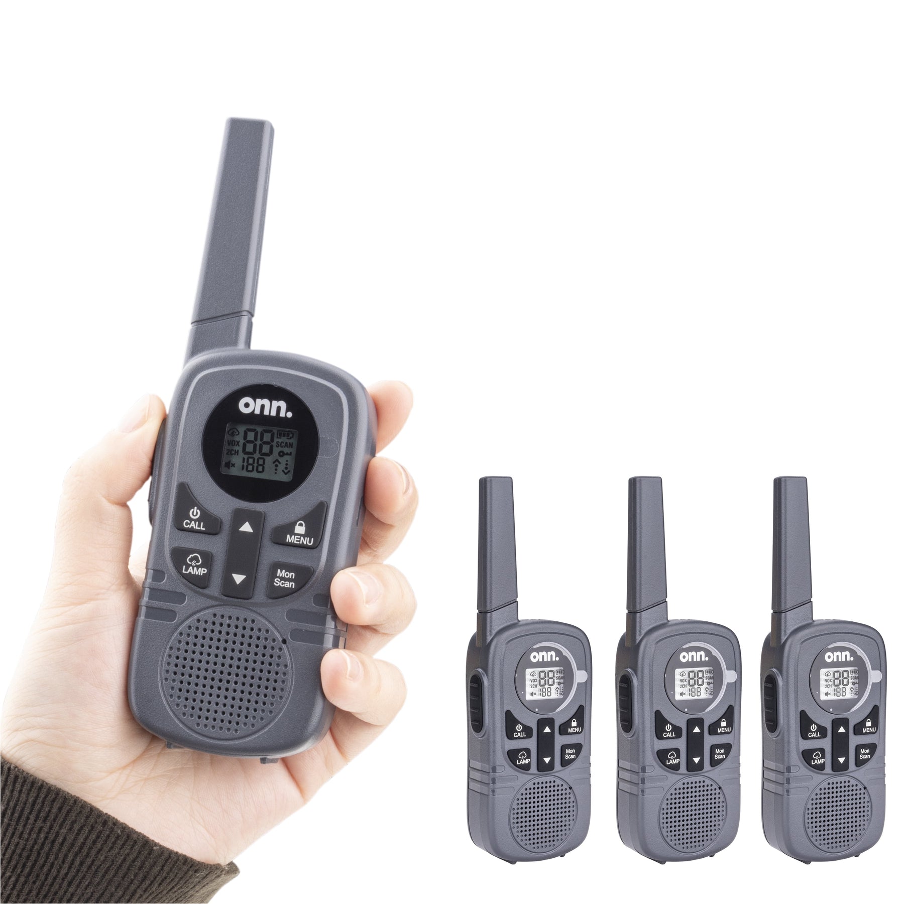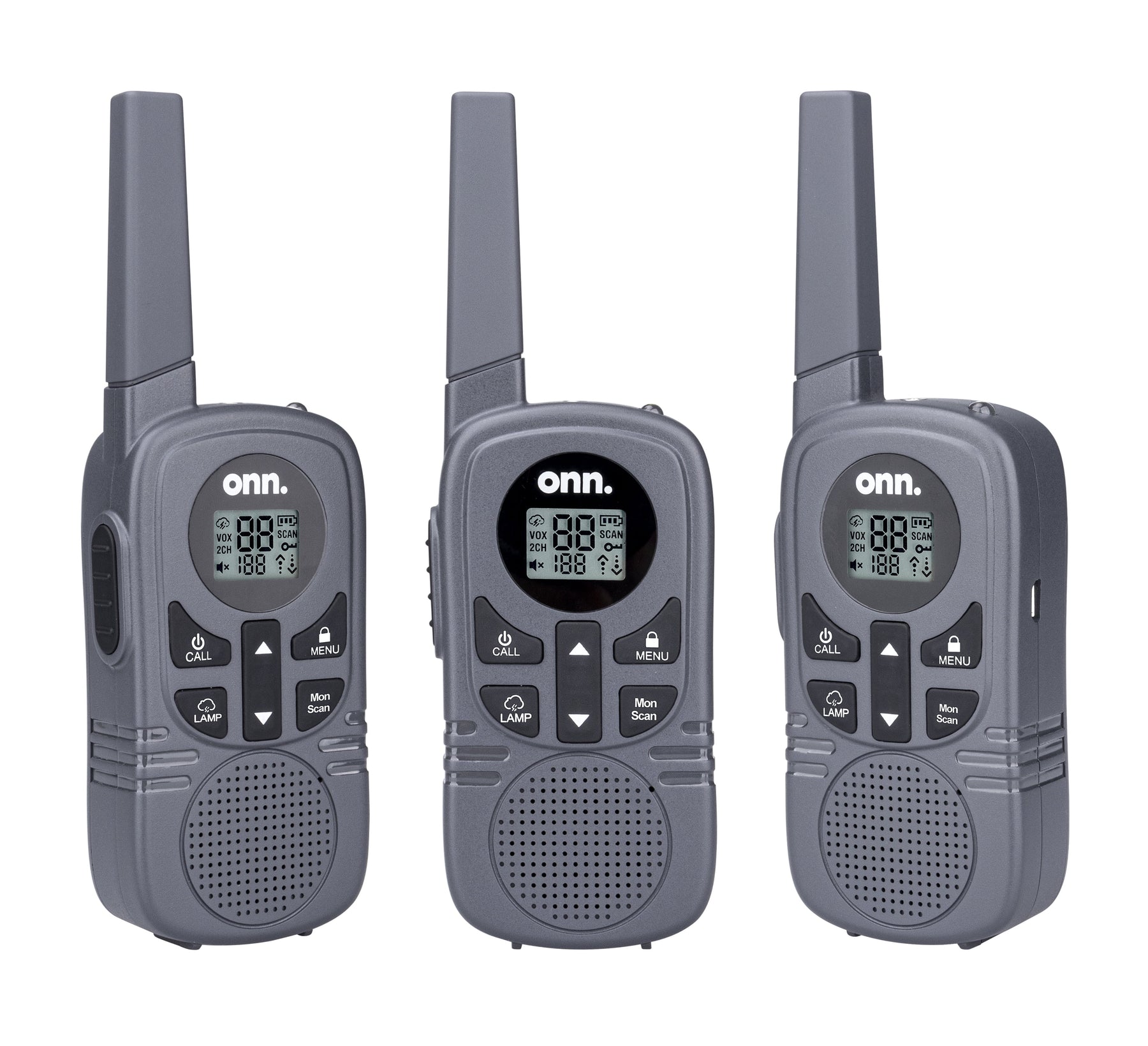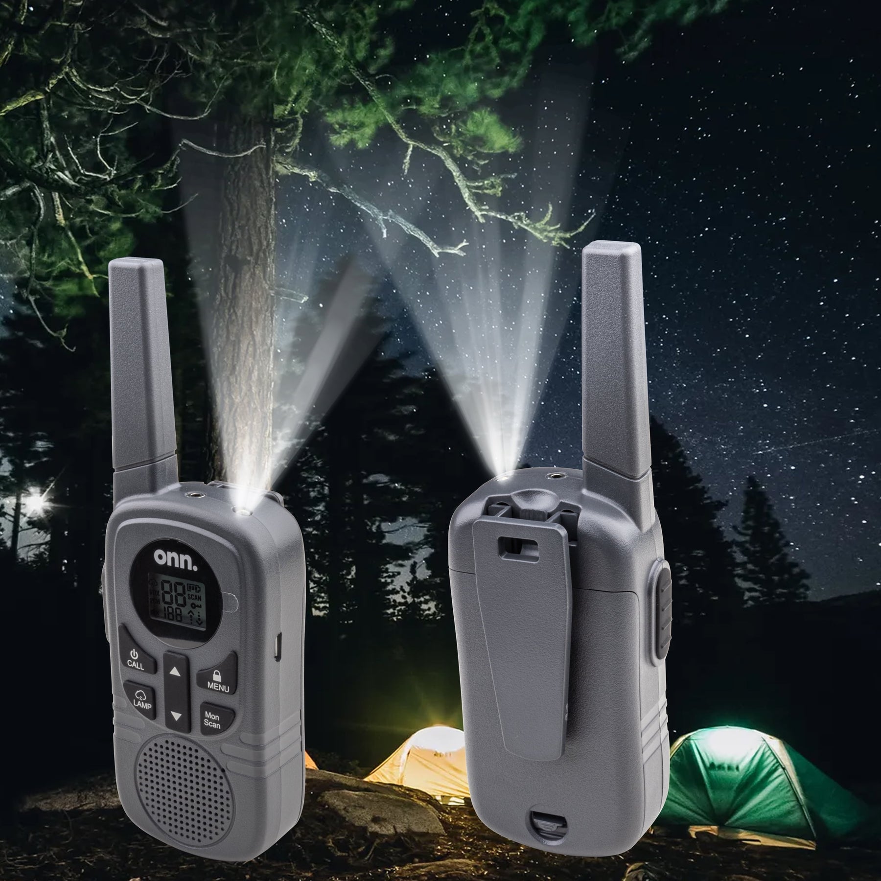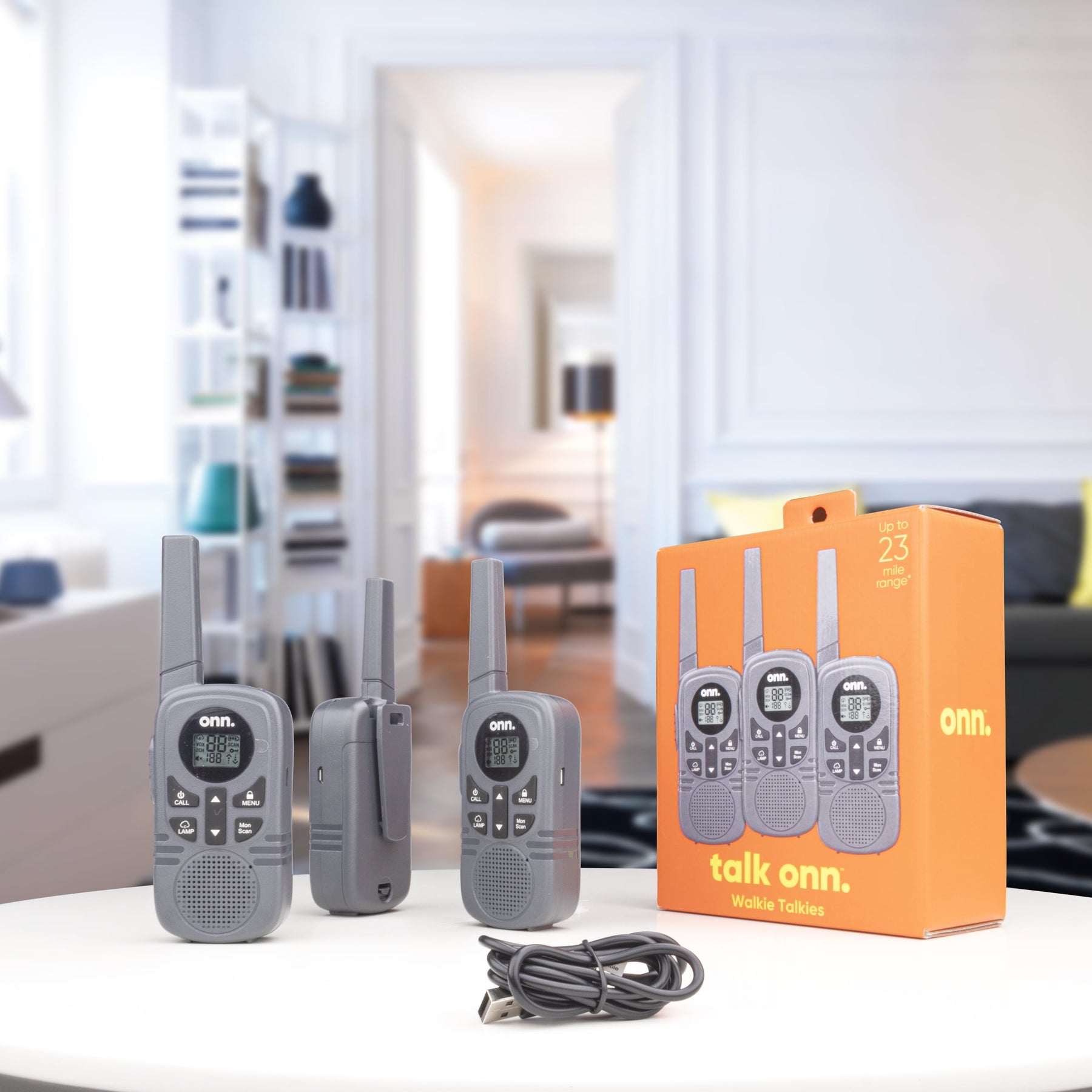 onn. 23 millas walkie talkie con radios de dos vías, luz led y 22 opciones de canales FRS, manténgase conectado con su familia y amigos! Ya sea que esté haciendo guardia sobre la casa del árbol del vecindario o caminando por su sendero de montaña favorito con su tripulación, nuestros Walkie Talkies lo mantendrán conectado cuando más importa. Mantenga sus comunicaciones privadas con 121 códigos de privacidad y mantenga la charla fuera de su canal con estos walkie talkies recargables que también vienen con clips de cinturón y cable de carga. La alarma del clima sonará indicando que hay un riesgo de mal tiempo en su área. Habla onn.