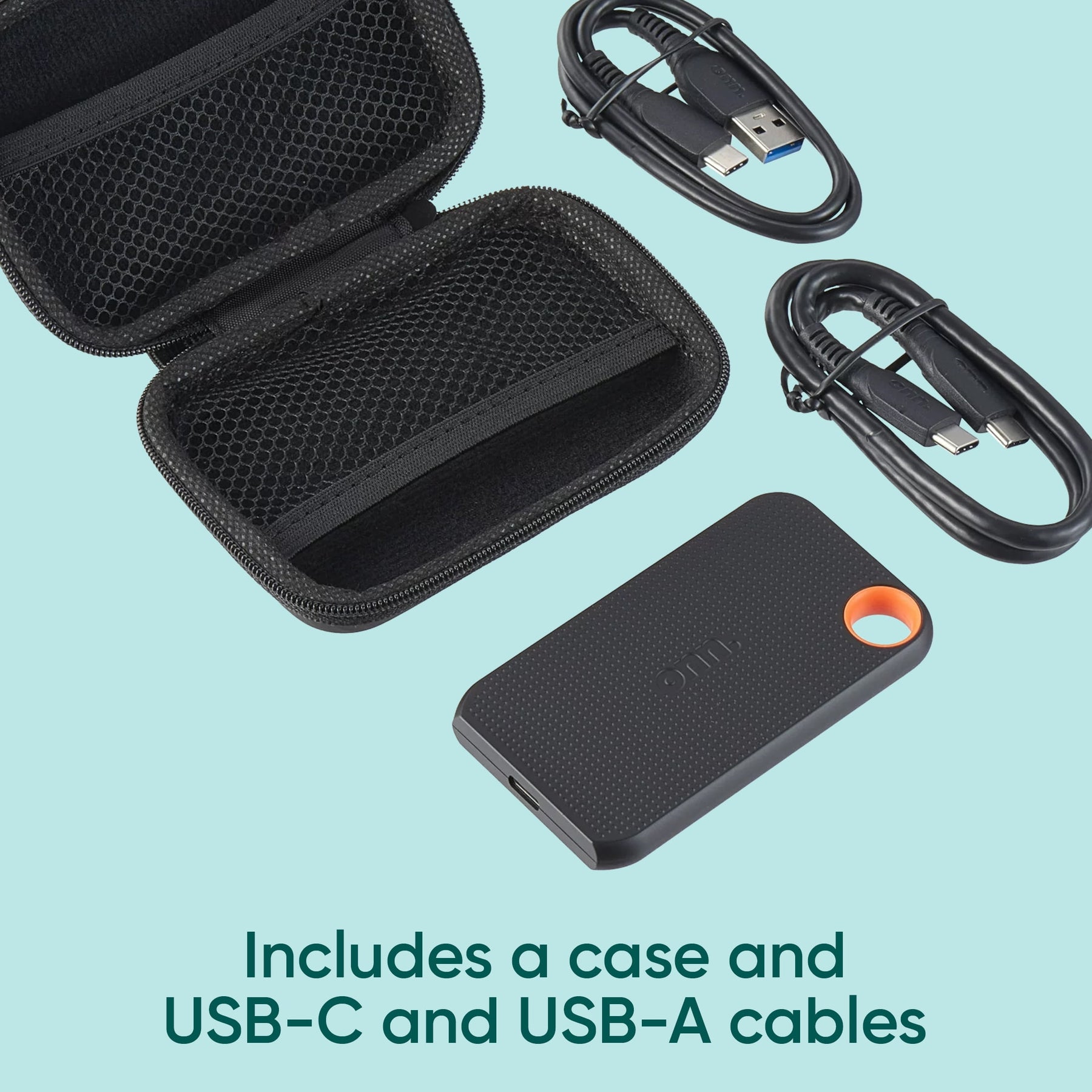 - ¿Qué hay en la caja? 1 unidad portátil de estado sólido ultrarrápida, 1 cable USB-C a USB-C de 1,31 pies (40 cm), 1 cable USB-C a USB de 1,31 pies (40 cm) y 1 funda rígida