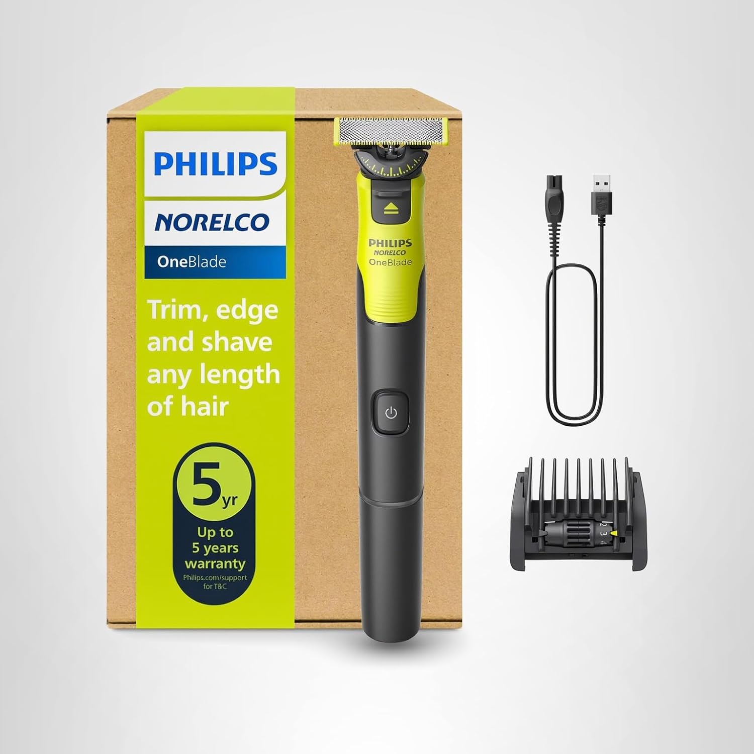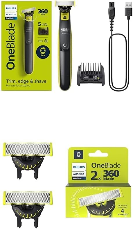 El juego incluye: 1 Philips Norelco OneBlade 360, 1 cuchilla 360, 1 peine ajustable 5 en 1 (0.039-0.197 in), 1 tapa de protección, 1 cable de carga USB-A, un manual de usuario (adaptador de corriente no incluido)