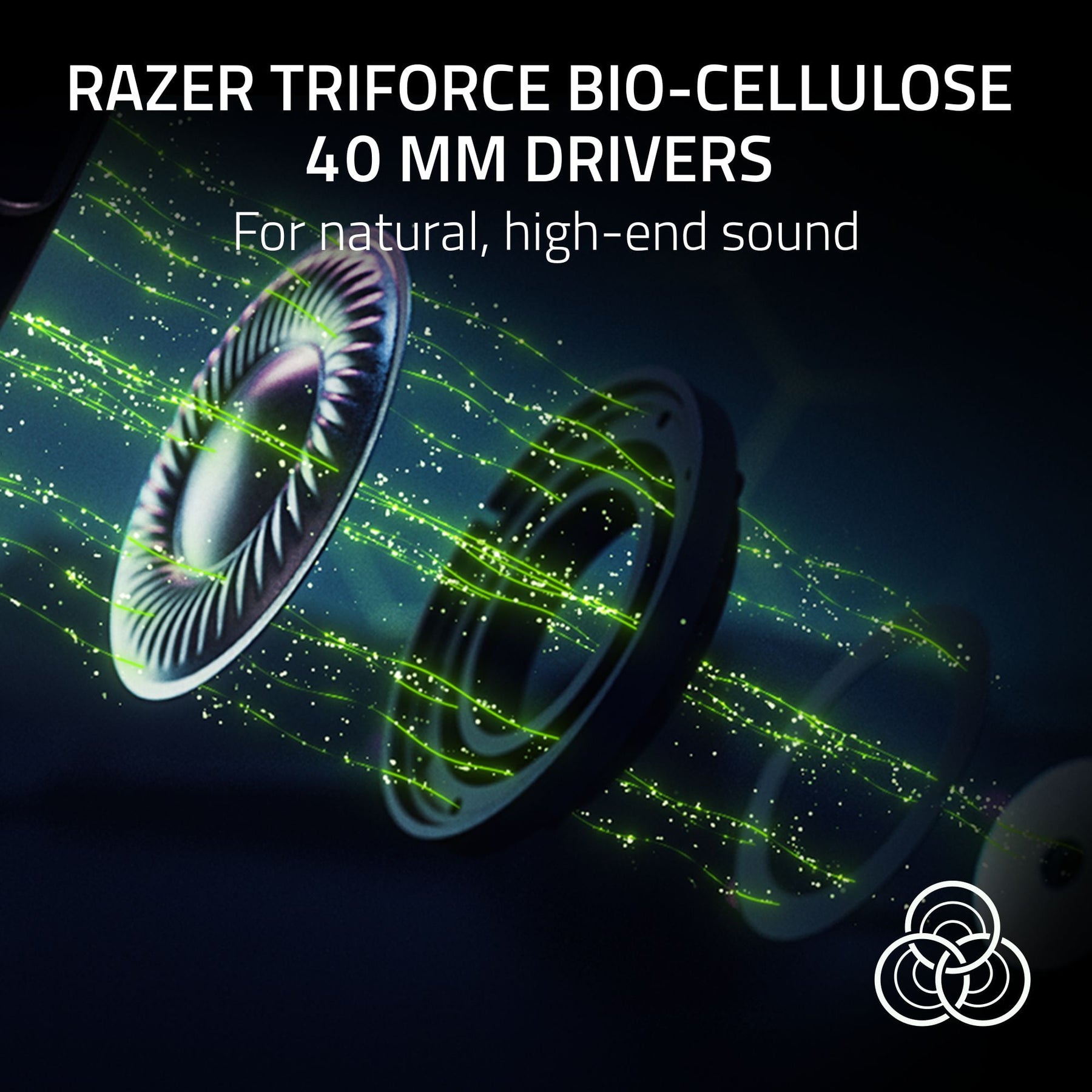 - Razer™ TriForce Bio-Cellulose 40 mm Controladores para un sonido natural y de alta gama. Nuestro diseño TriForce actualizado utiliza un diafragma de biocelulosa ultrafino, mejorando el escenario sonoro y reduciendo la distorsión para una claridad distintiva y una reproducción profunda de los graves.