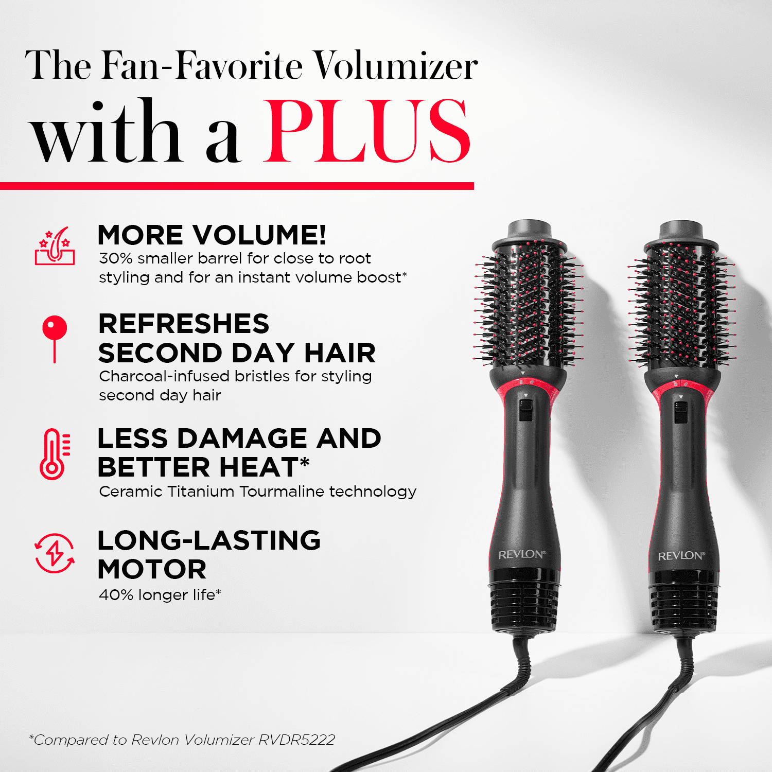 • 75% Brillo en un solo paso: Estilo, Seque y Volumine su cabello en un solo paso para explosiones de estilo de salón en casa y experimente explosiones 75% más brillantes con el Voluminizador Revlon Plus.