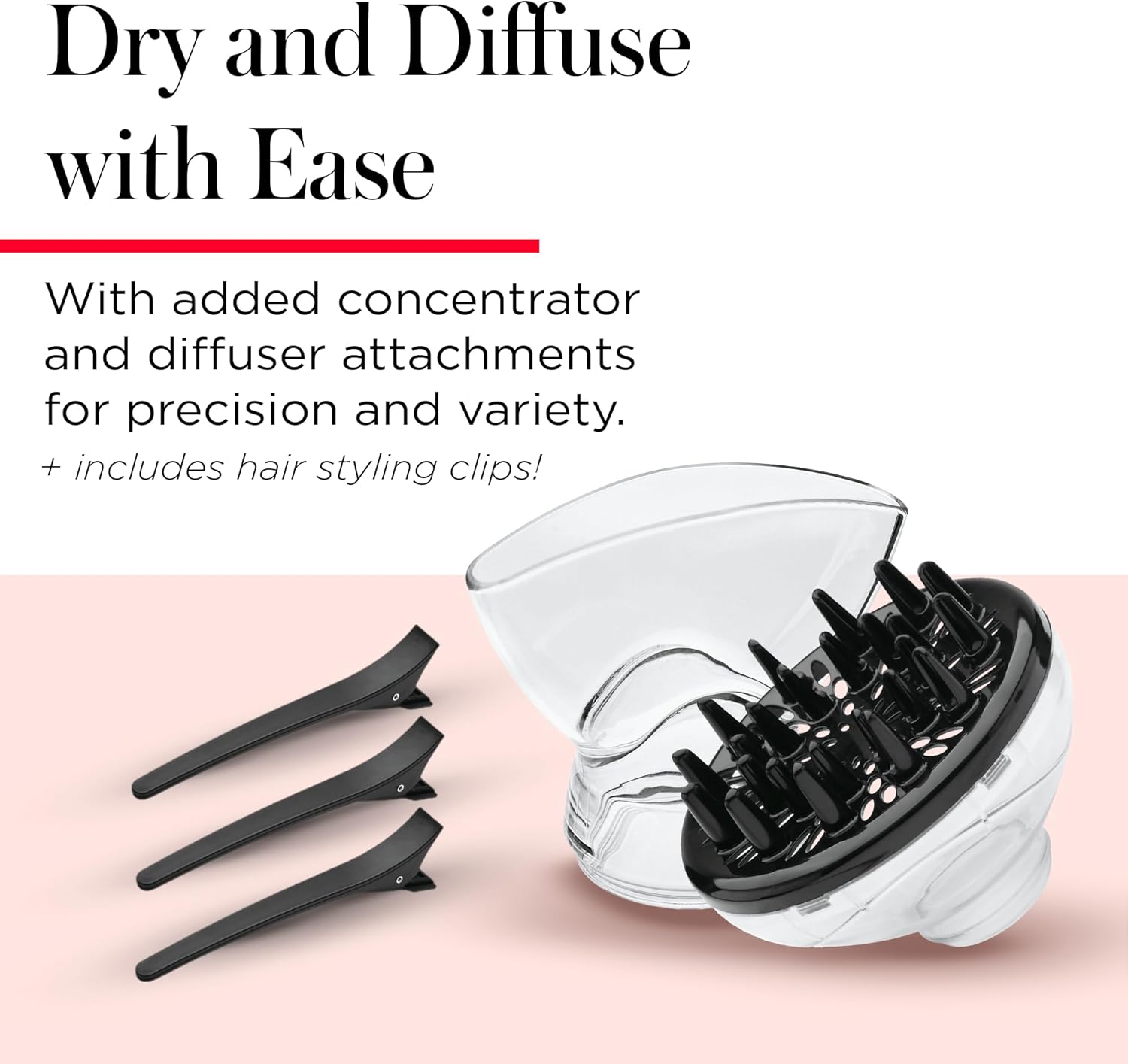 Concentrador y difusor incluidos y 3 pinzas para separar el cabello incluidas.