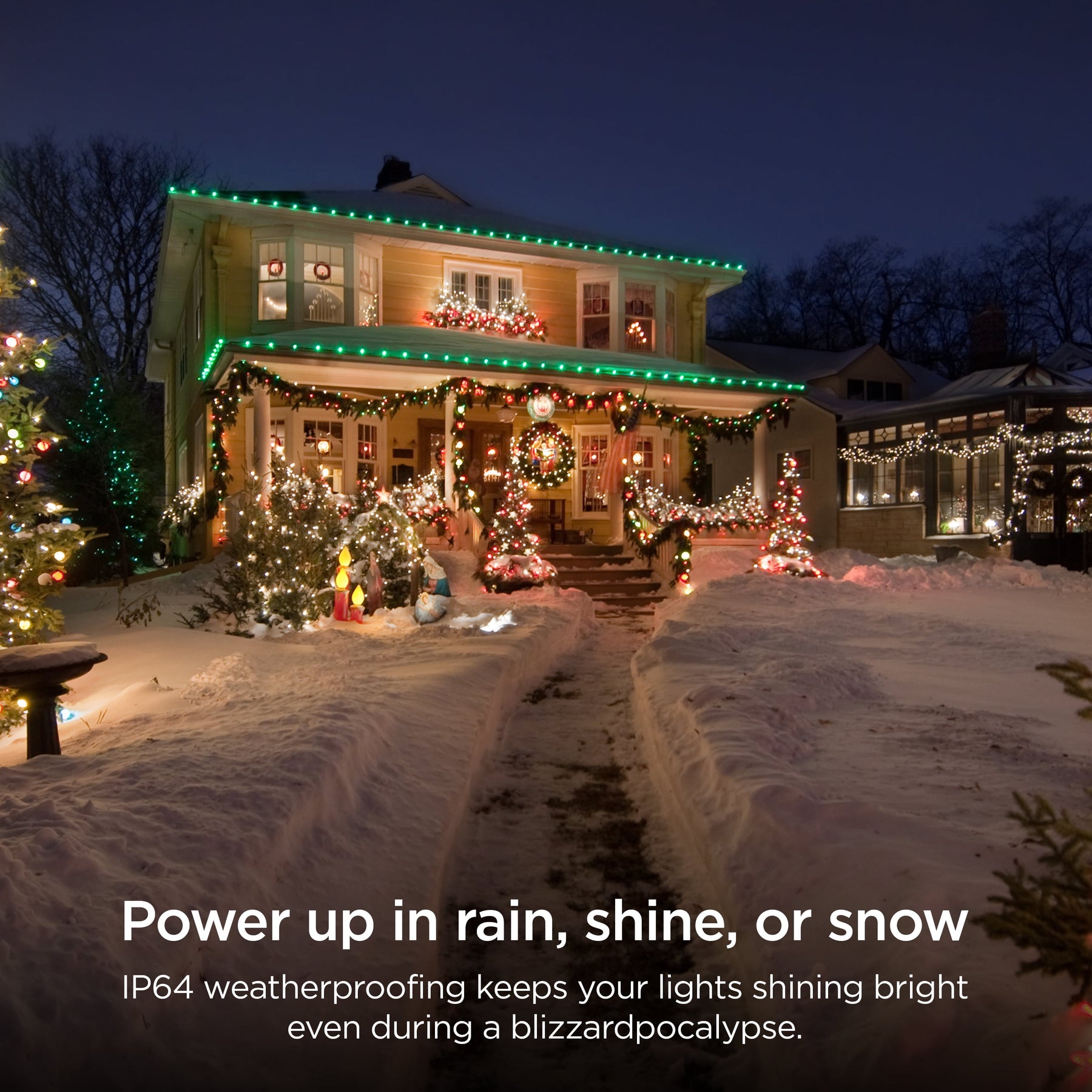 - Resistencia a la intemperie: la resistencia a la intemperie IP64 mantiene sus luces brillantes incluso durante una ventisca.