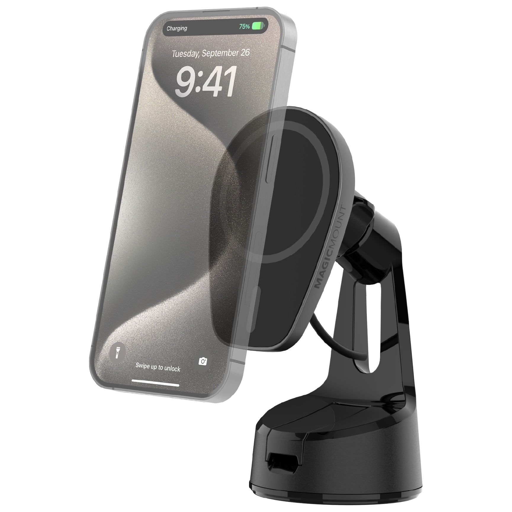 - Fuerte sujeción magnética: Disfrute de la tranquilidad con nuestro cargador inalámbrico MagSafe. Equipado con potentes imanes de neodimio de tierras raras y una fuerte base de ventosa StickGrip, este soporte para teléfono MagSafe ofrece una sujeción segura en el tablero de su automóvil, parabrisas, escritorio de oficina o cualquier superficie firme y plana.