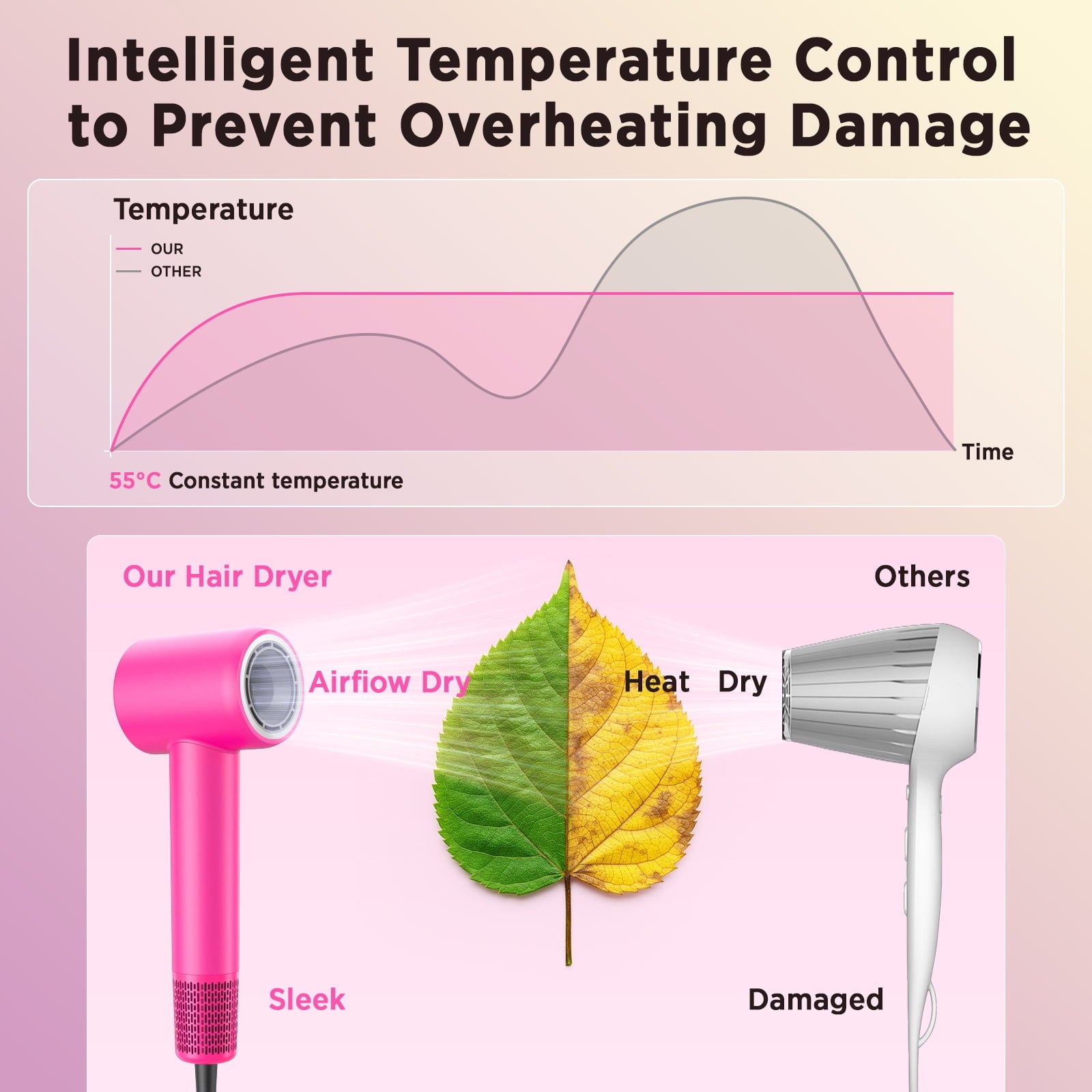 • [Rendimiento de alta velocidad y secado de 3 minutos] El motor de 110,000 RPM ofrece un flujo de aire de tornado de 40 M / S para un secado de 3 minutos, ideal para las rutinas matutinas de los papás ocupados. El rendimiento a nivel de salón con ajustes de 2 velocidades y 3 temperaturas (caliente/caliente/frío) evita daños por calor. Regalos de graduación perfectos para estudiantes universitarios.
