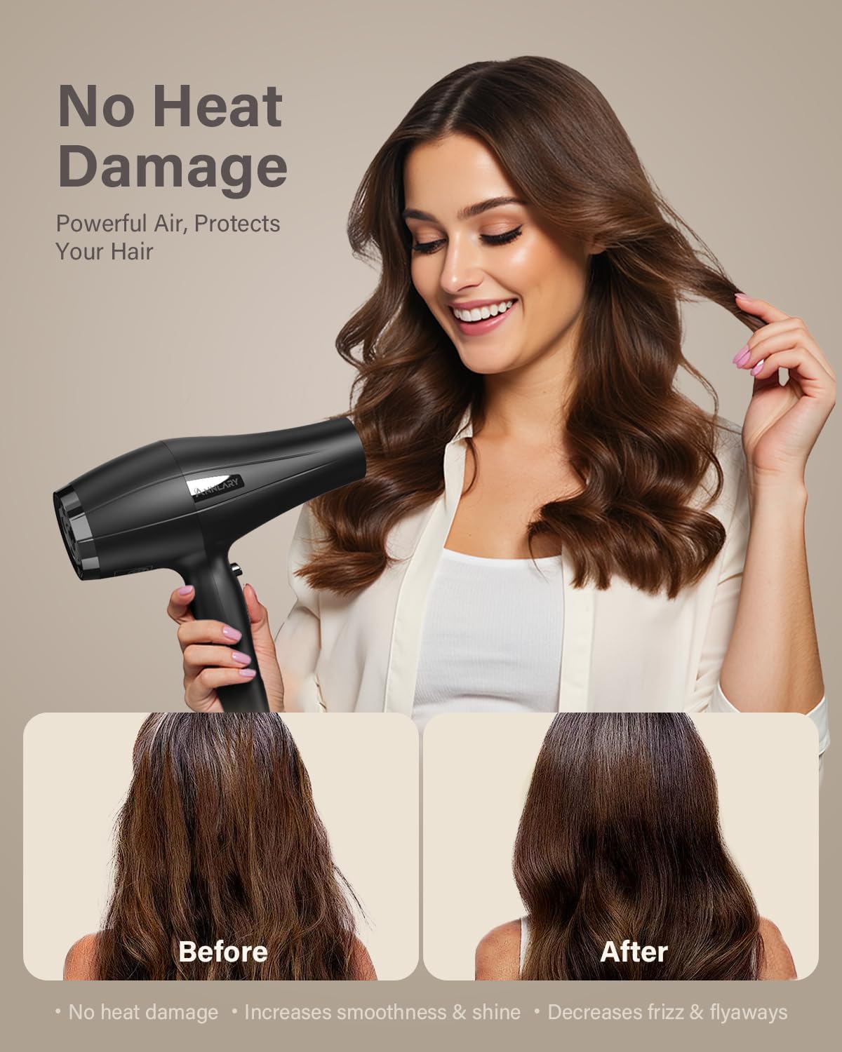 Cuidado iónico y protección térmica inteligente: millones de iones negativos combaten el encrespamiento, bloquean la humedad y aumentan el brillo para un cabello de aspecto más saludable. El control inteligente de temperatura NTC evita el calor excesivo, protegiendo tanto tu cabello como la secadora mientras garantiza un secado seguro y eficaz.