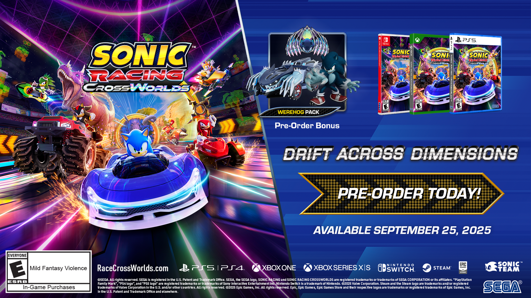 - Ready, Set, Warp! Race across 24 tracks and warp to 15 CrossWorlds with Travel Rings, a unique gameplay mechanic that transports the iconic characters from the Sonic and Sega universes into new dimensions. Use unpredictability to your advantage as you change the landscape of each race! Race with the Best! Choose from 23 iconic Sonic characters, the largest roster of any Sonic Racing game! Make it Yours! Mix and match between 45 unique original vehicles and 70 different gadgets to trick out your ride, level up your kart, and create the ulitmate machine to match your racing style. Gain the Advantage with Powerful Items! Dominate your opponents with 23 different items including returning favorites and all-time items like the Monster Truck! Multiple Ways to Play! Gather with friends and play local split screen in Grand Prix and the new party mode Race Park, compete against a community of players from around the world with up to 12 players online in World Match, or test your driving skills in Time Trials.