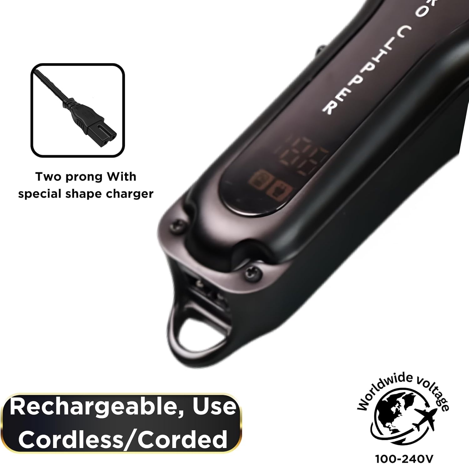 【Utiliza cable o inalámbrico】Más de 300 minutos de uso continuo inalámbrico en una sola carga. Pro Clipper también se puede utilizar con cable (mientras se carga) o inalámbrico sobre la marcha. Carga universal con cargador USB y voltaje dual mundial de 100-240V. La pantalla LED muestra el estado de la batería o cuándo es el momento de cargar su Clipper. Ideal para barberos de viaje, vacaciones o viajes de negocios.