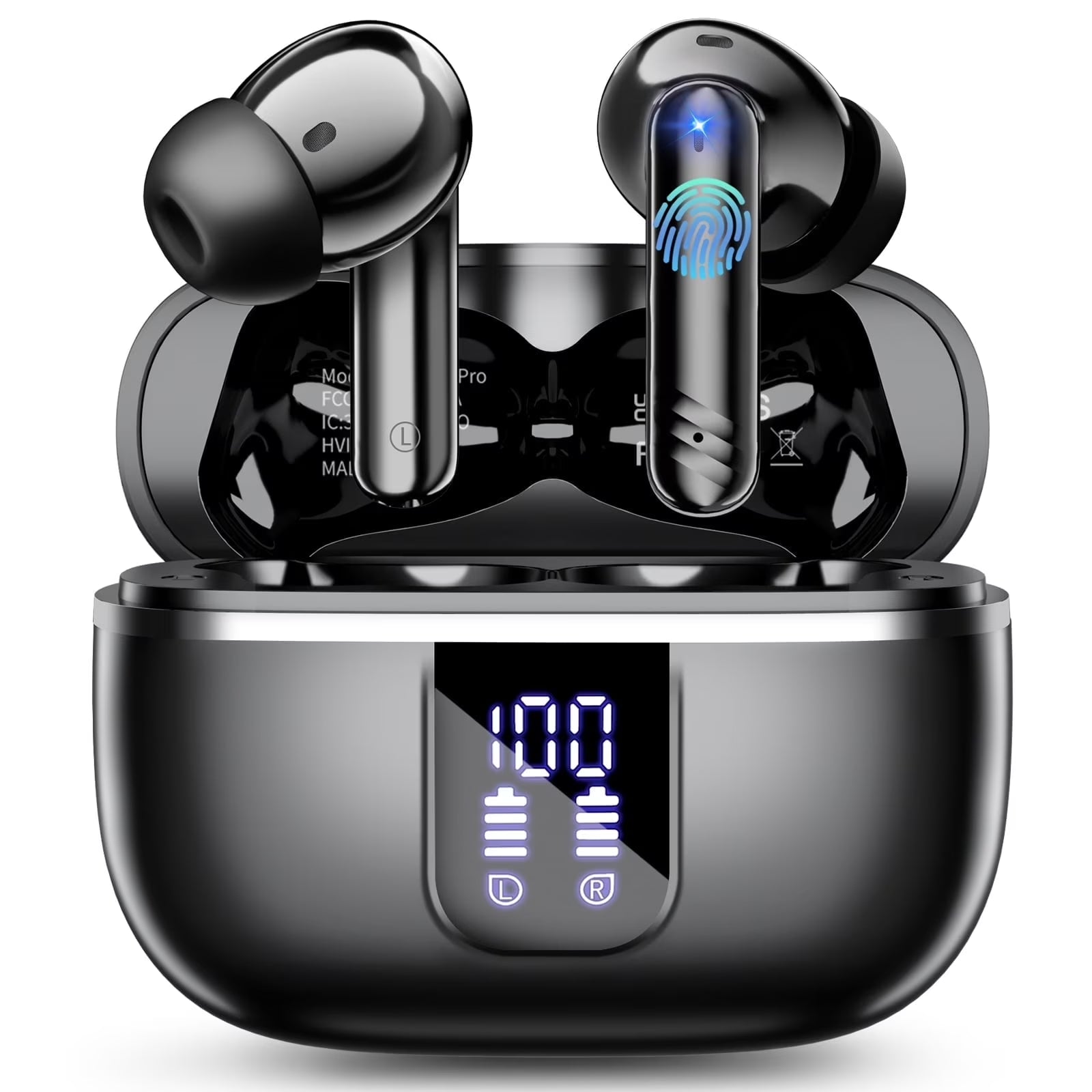 Auriculares Inalámbricos Bluetooth, Auriculares con Cancelación de Ruido y Bajo Profundo, 38H de Tiempo de Reproducción, Pantalla LED, Impermeables, Auriculares In-Ear con Micrófono para Iphone Android Deportes Entrenamiento, Negro