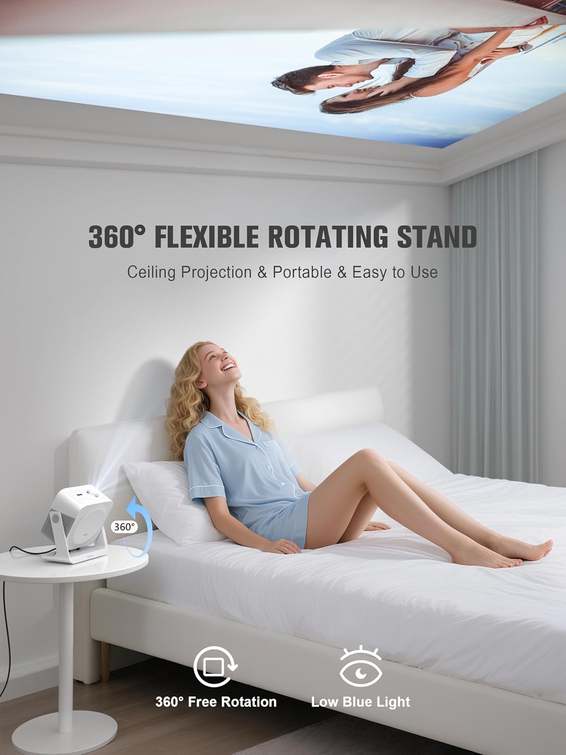 El elegante cuerpo portátil gira 360° para proyectarse en techos o pantallas de patio en ángulo, perfecto para viajes de campamento y películas portátiles al aire libre.
