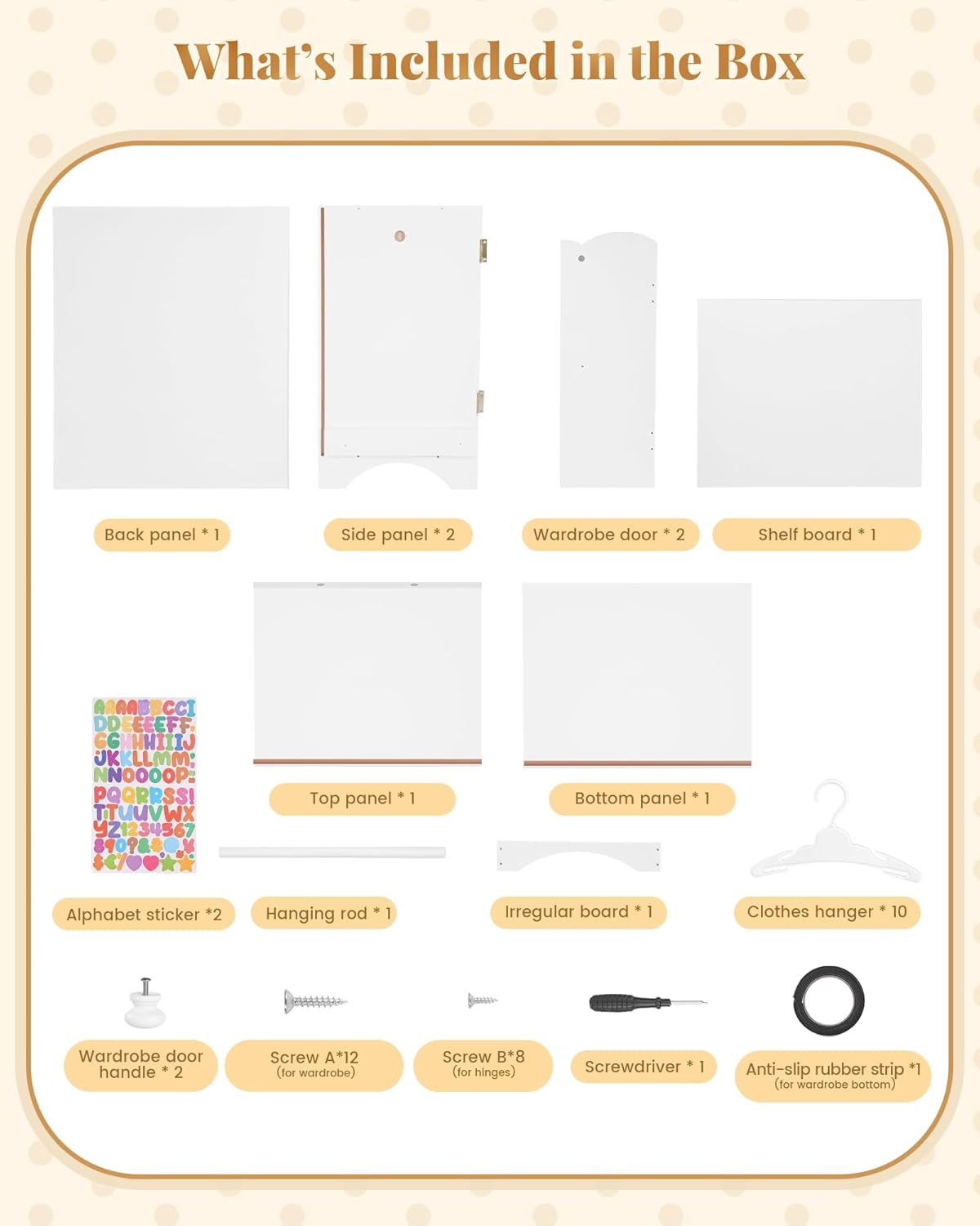 • Easy Assembly with All Accessories Included: This baby doll wardrobe comes with a complete set of assembly tools, including screws, screwdriver, and alphabet stickers for added customization.