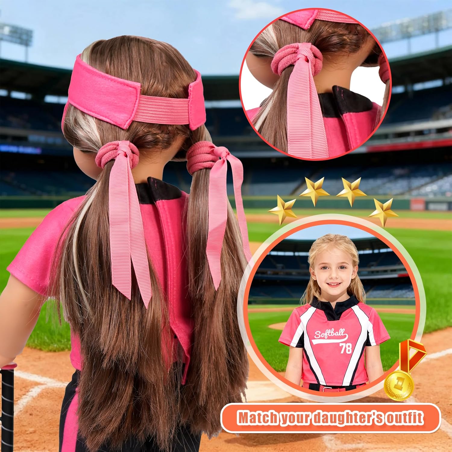 A las niñas les encantará el accesorio para el cabello de doble cola de caballo con lazo en el juego rosa rosa, creando un aspecto dulce y fresco para la muñeca de béisbol.