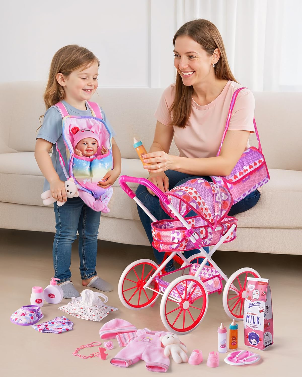 Juego interactivo para niñas pequeñas: deja que tu hijo se cuide y cuide como una verdadera mamá: alimente a la muñeca, cambie de ropa, dé un baño o salga a caminar con el cochecito de bebé para muñecas y portador.