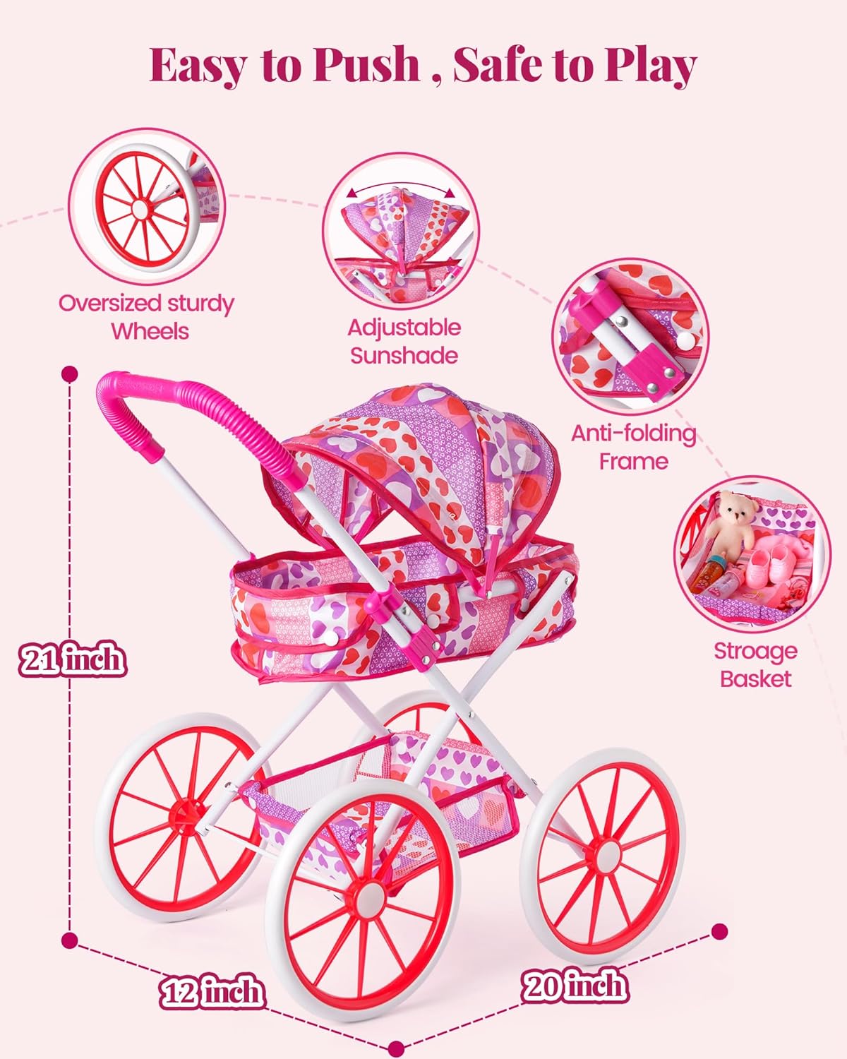 Cochecito de muñeca resistente y fácil de empujar: nuestro cochecito de muñeca de bebé cuenta con un parasol plegable, una cesta de almacenamiento y un bolso de mano.