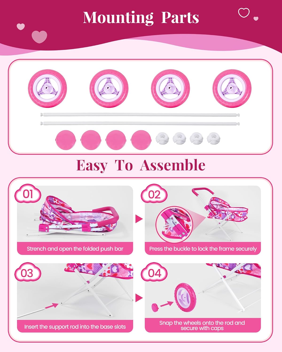 • Seguro, fácil de montar y fácil de usar: el cochecito portátil para muñecas cuenta con un diseño de bloqueo seguro para ayudar a evitar pellizcos de dedos y se monta rápidamente, por lo que es fácil de instalar para los padres y fácil de usar para los niños.