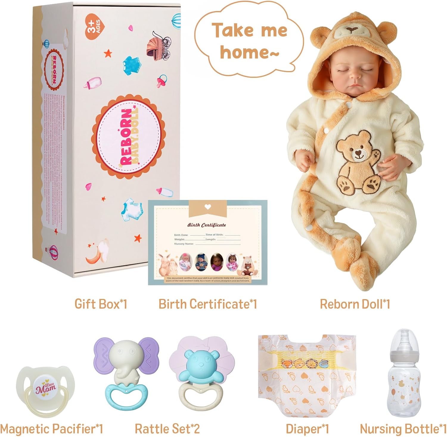 • Take Him Home Now: This reborn doll set arrived with Baby doll*1, Nursing bottle*1, Pacifier*1, Birth certificate*1,Clothes set as pictured *1 and Gift box *1.