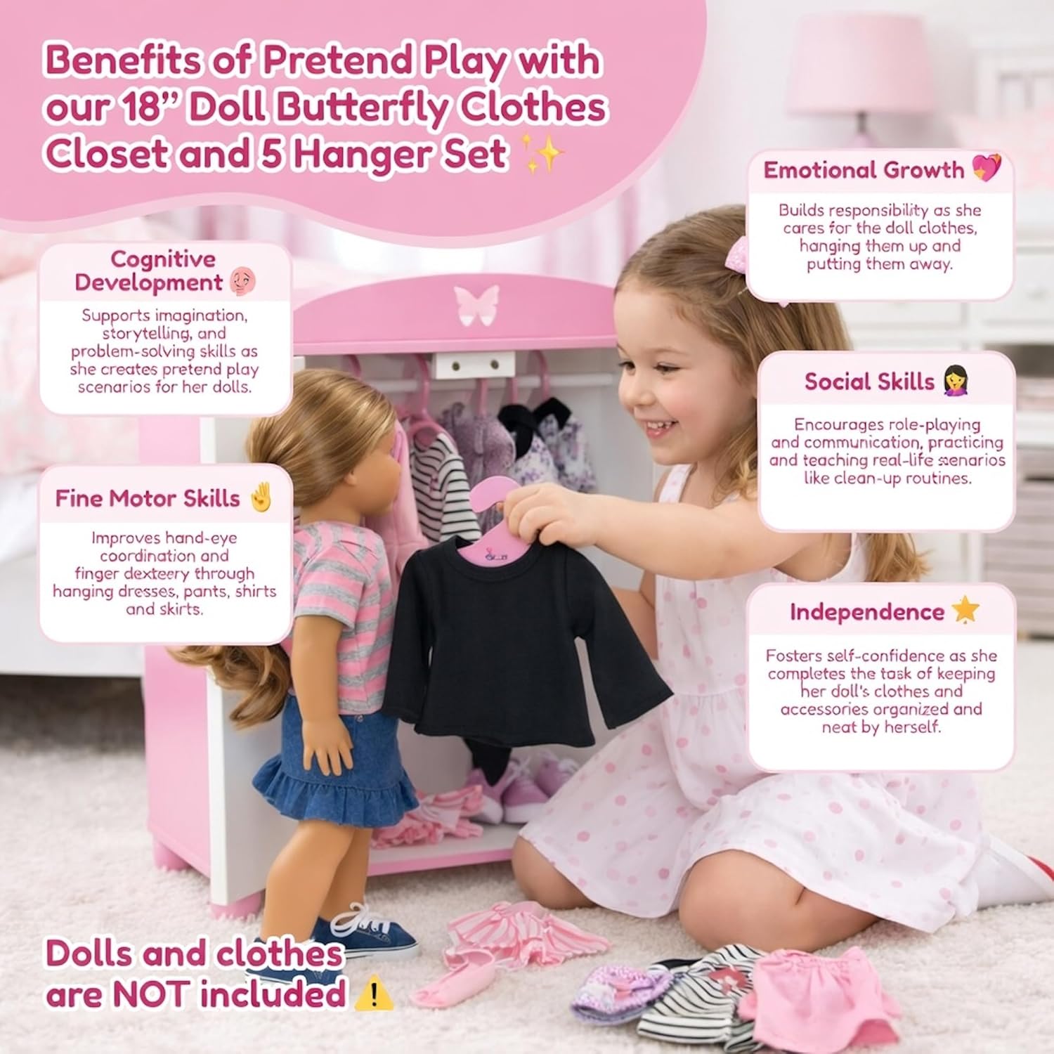 • El armario de almacenamiento para muñecas viene con 5 perchas rosas del tamaño perfecto.