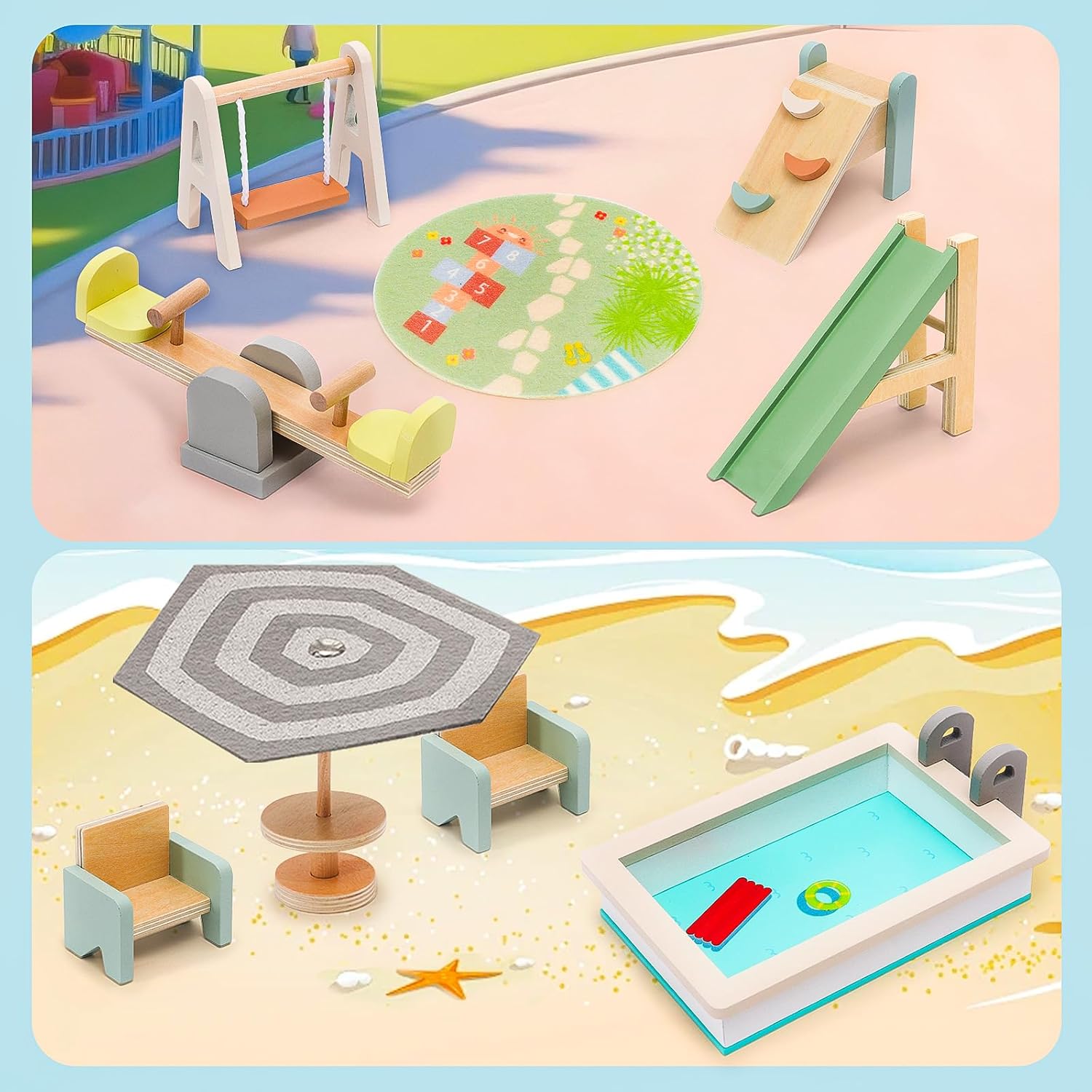 • Complete wooden dollhouse furniture set featuring a vibrant outdoor scene with doll house accessories such as playground (slide, swing, seesaw), picnic area (BBQ grill), pool zone (swimming pool, lounge chair, umbrella), and gardening section (wheelbarrow, flower beds) for endless imaginative play and storytelling in any doll house.