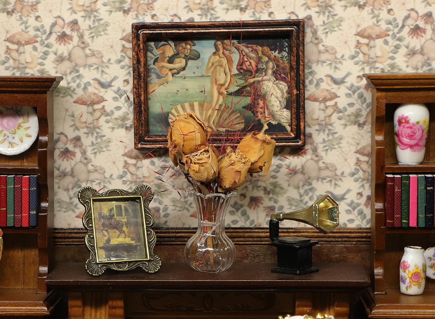 • -- EXQUISITE DOLL HOUSE FURNITURE: This Victorian dollhouse furniture set includes 1 set of vibrant diamond pattern sofas and couches, 2 carved patterned tables, 1 exquisite glass vase, 1 woven carpet, and the framed artwork The Birth of Venus brings sophistication and cultural flair to your dollhouse.