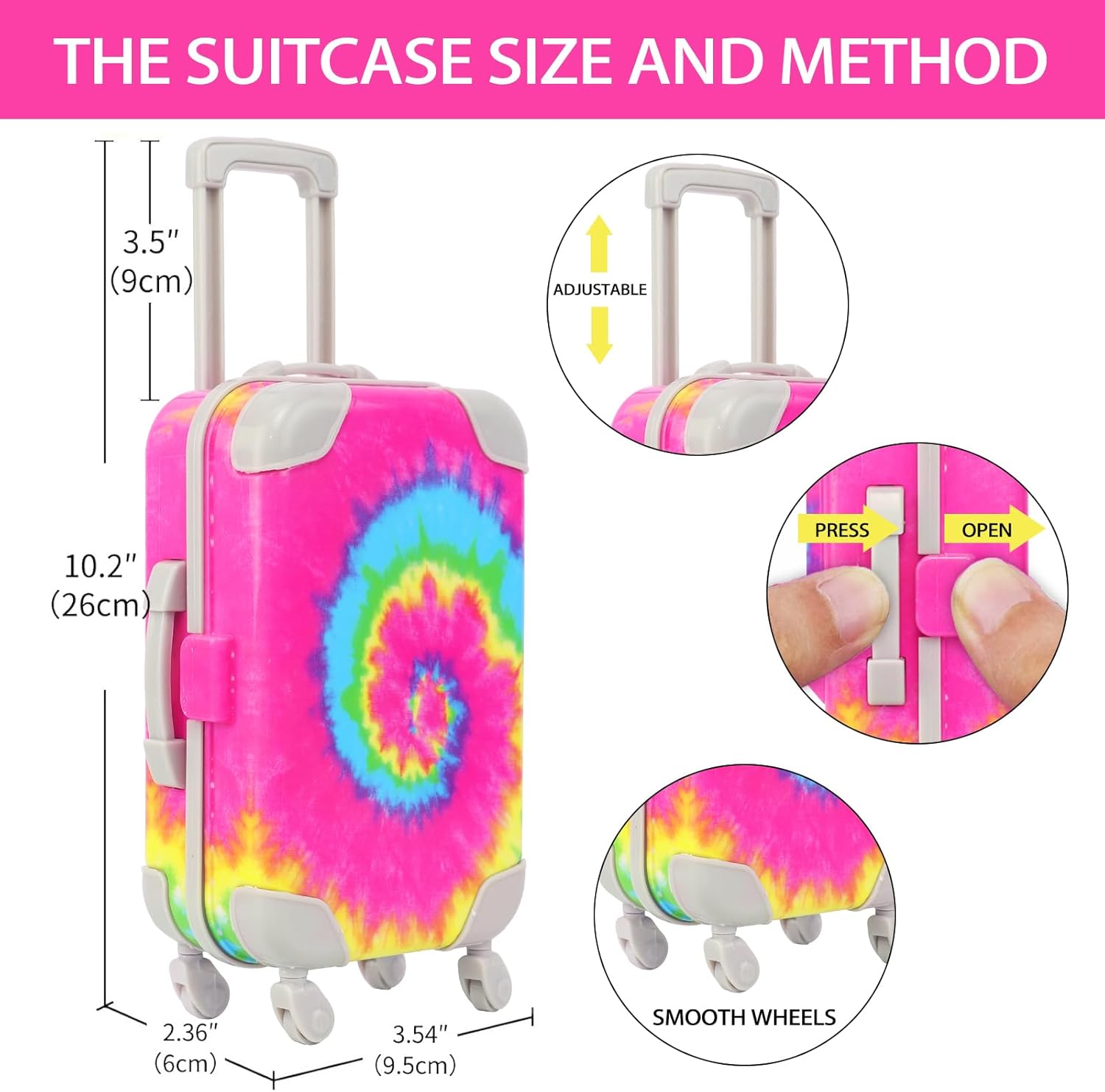 • 18 Inch Doll Accessories Set: Rainbow Tie-Dye Suitcase with Retractable Handle & Rolling Wheels Stores 14PCS Accessories: 1 Doll Suitcase, 1 Doll Waist Bag, 1 Doll Skirt, 1 Tops, 2 Makeup Kit (Eyeshadow/Lipstick), 1 Toy Phone/ 1 Passport/ 1 Credit Cards/ 2 Flight Tickets & 1 Crystal Stickers, 2 Hair Ties (Doll and Shoes are Not Included).