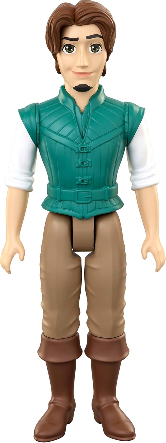 Disney Rapunzel Character Set incluye una muñeca Rapunzel en su aspecto característico, Flynn Rider, Mother Gothel, y Maximus el caballo con una silla de montar y brida.