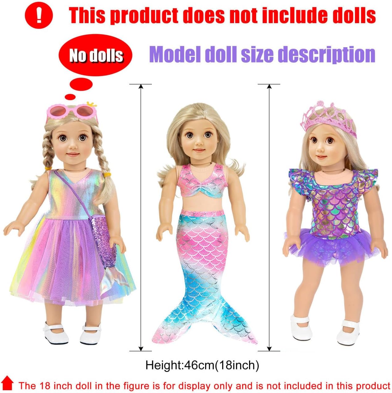 • 18 inch Doll Accessories Include: 1*Luggage, 1*Mermaid Skirt, 1*Top, 1*Crown Headband, 2*Dresses, 1*Bag, 1*Pillow, 1*Eye-shade, 1*Glasses, 1*Camera, 10*Cashes, 2*Tickets, 1*Bank Card, 1*Passport Card (No Doll)