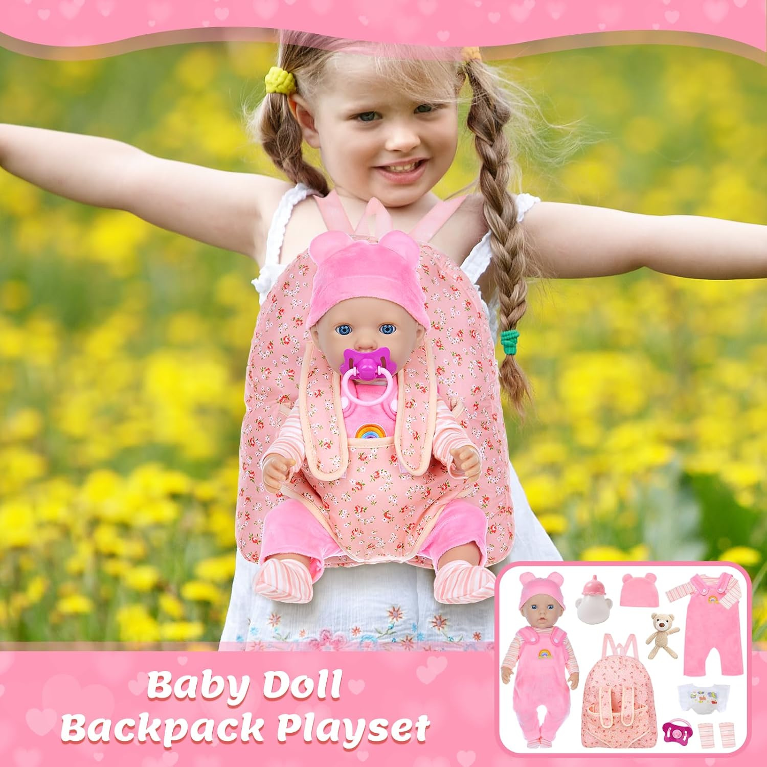 • El paquete contiene: Total 9 piezas de artículos: 1 mochila+2 juego de correas+1 sombrero+1 biberón+1 chupete+1 pañal+1 muñeca marrón+1 par de calcetines (muñeca no incluida)